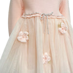 Abito svasato elegante manica lunga con corpetto in lana e gonna in tulle, con applicazioni di fiori in lana.
