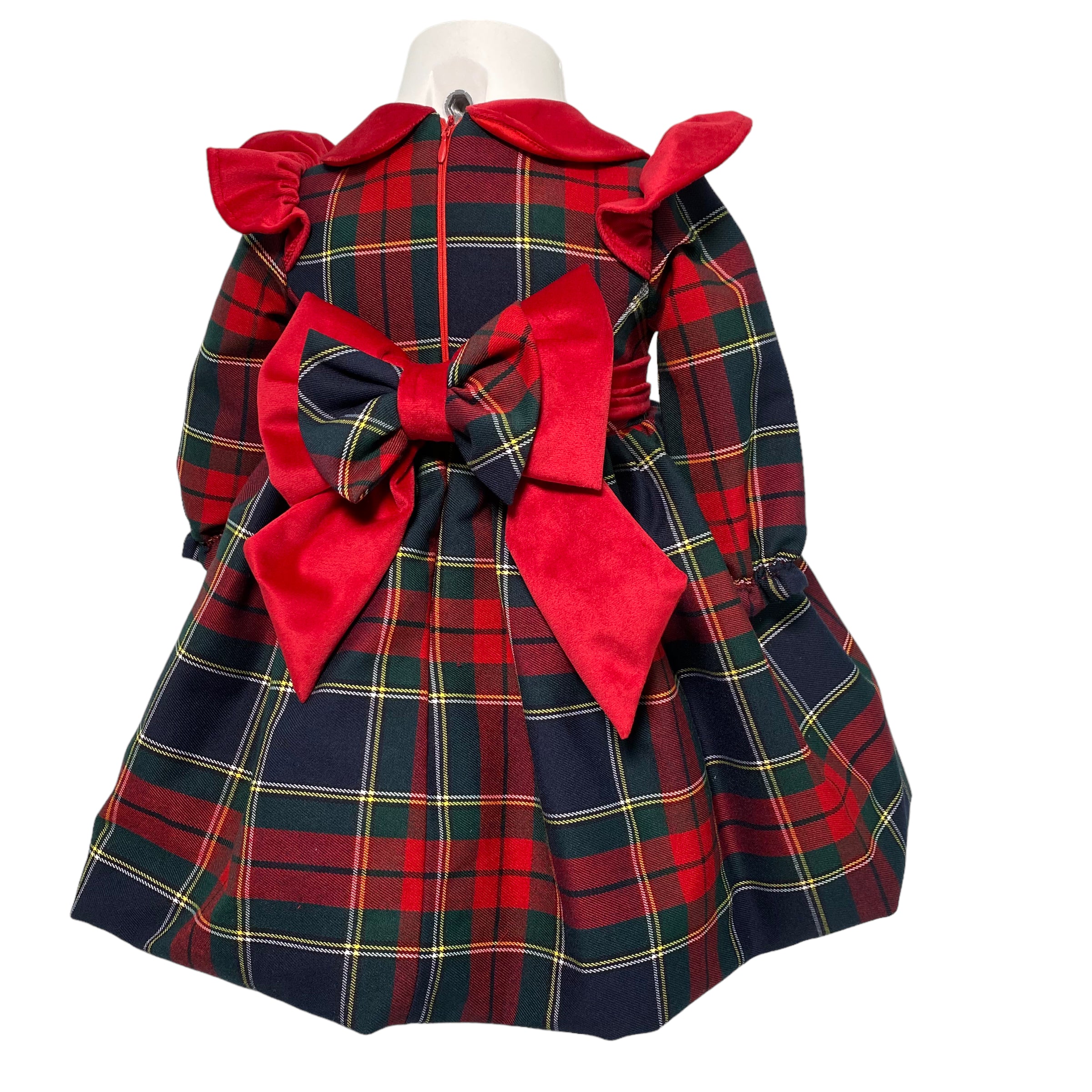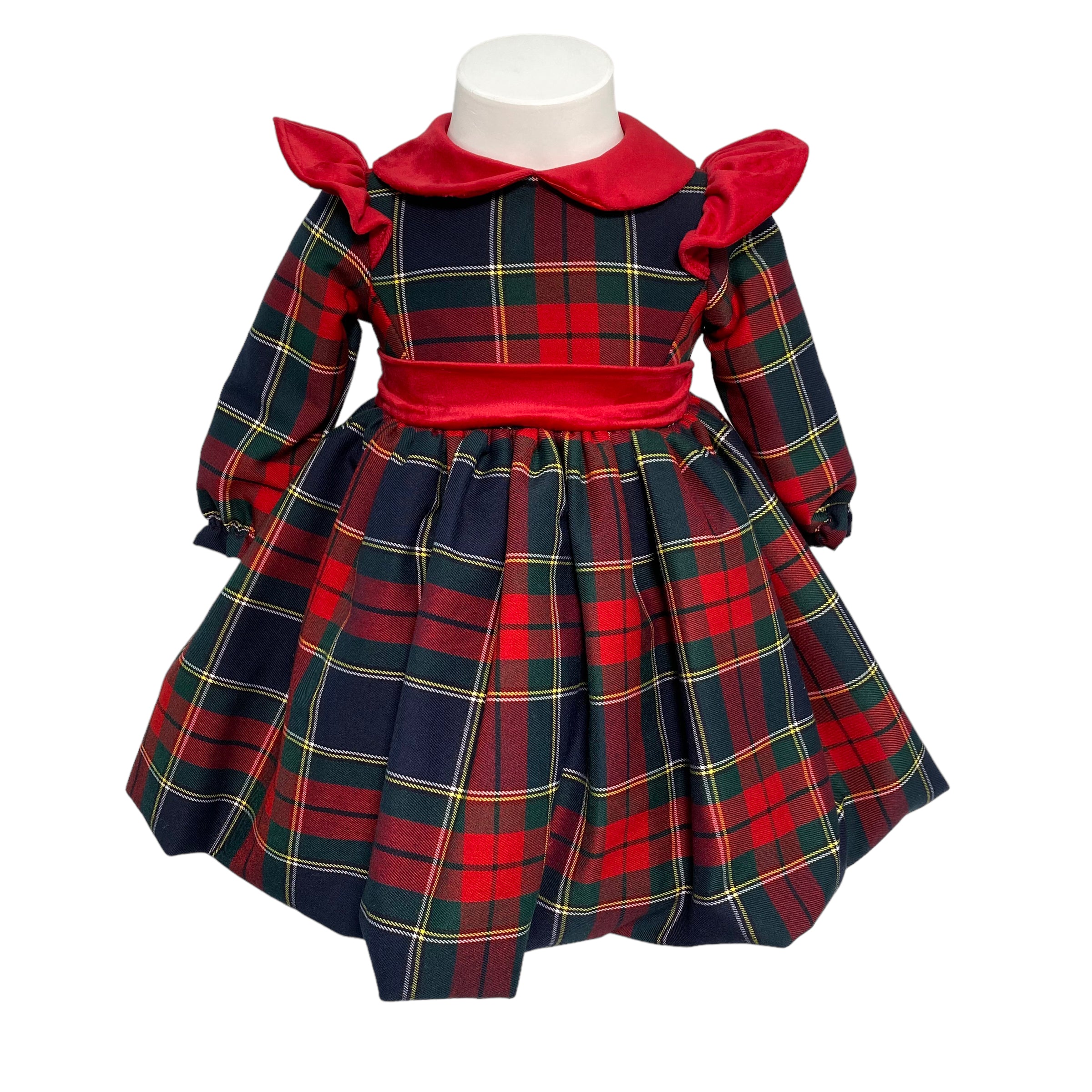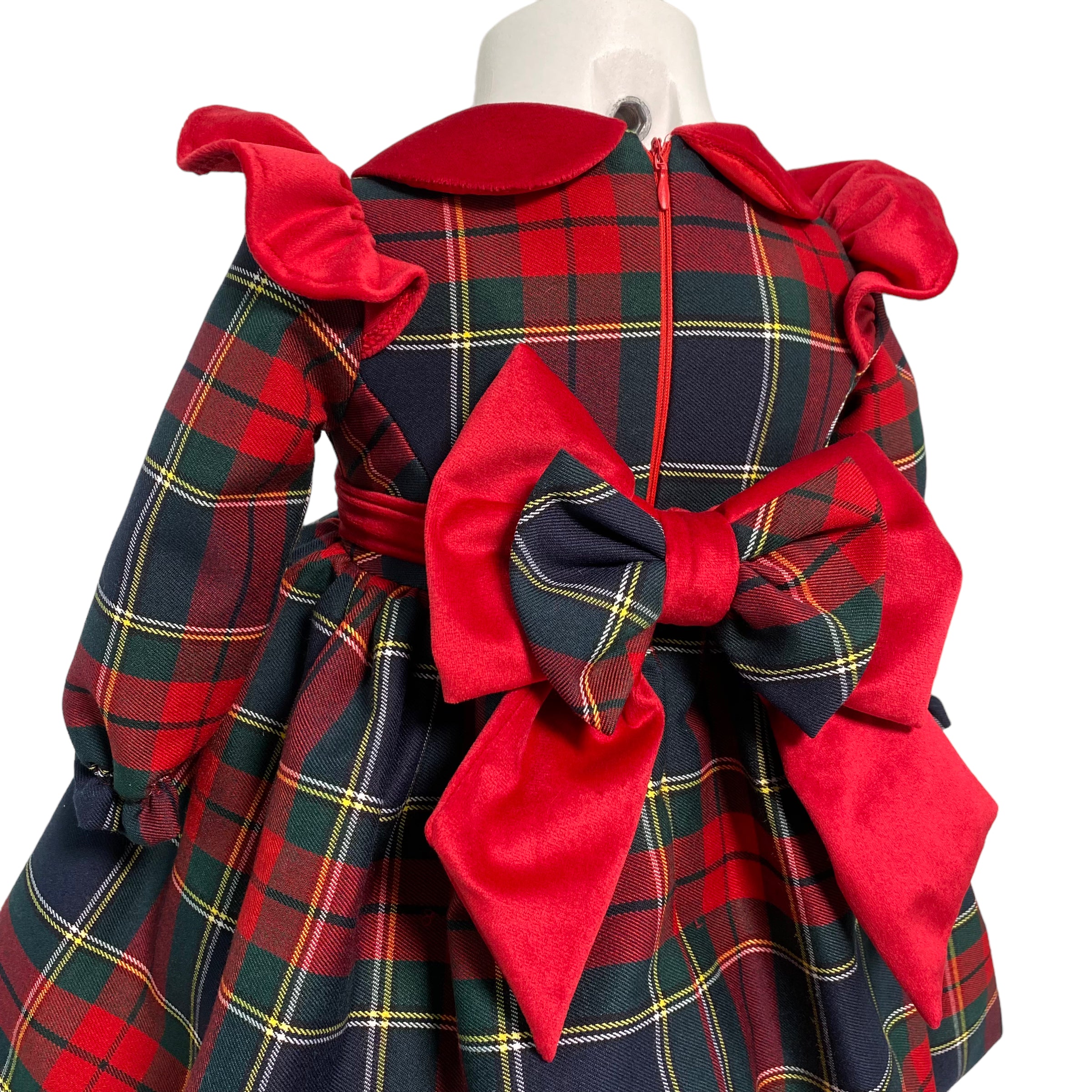 Abito svasato manica lunga, fantasia scozzese, con colletto e fascia in velluto rosso.