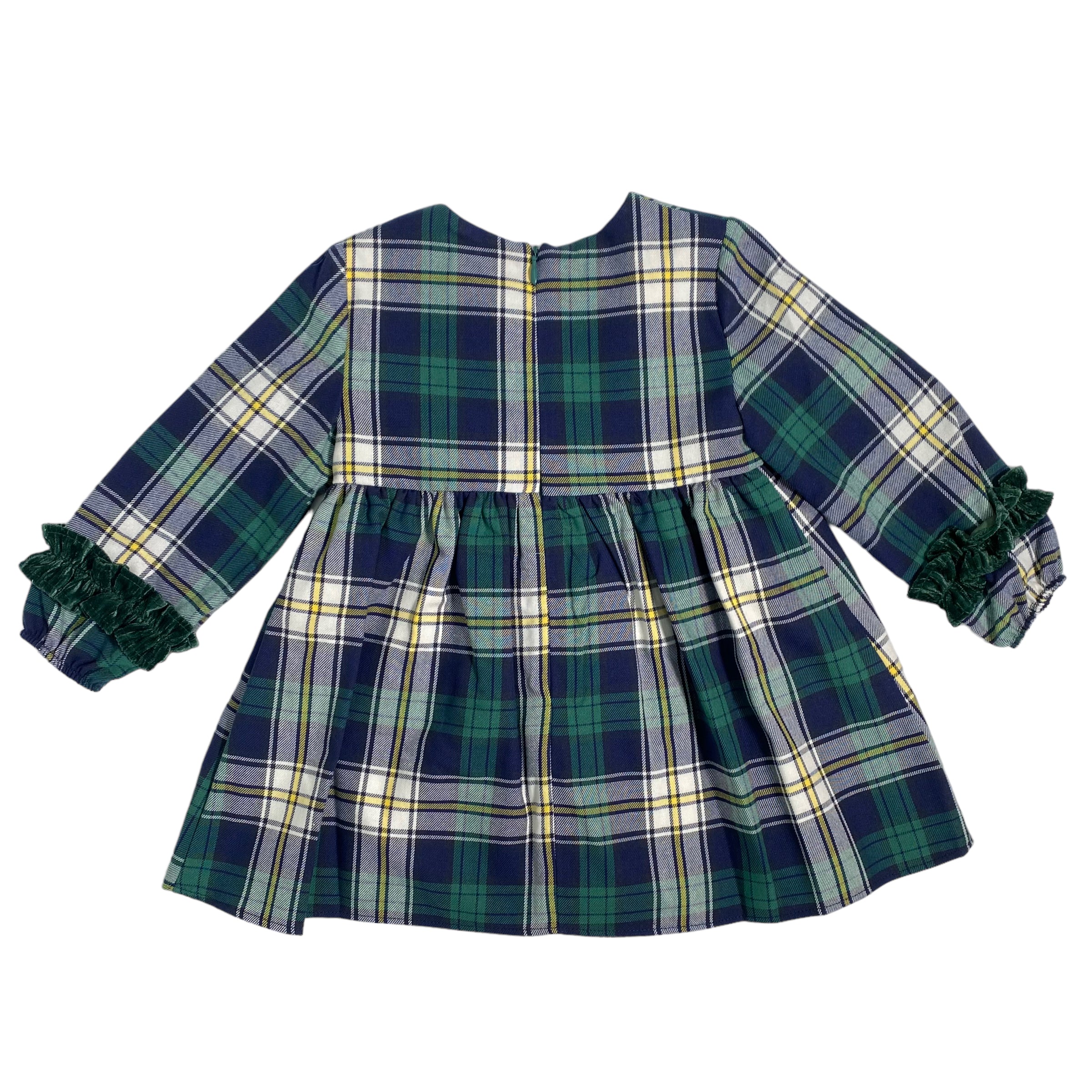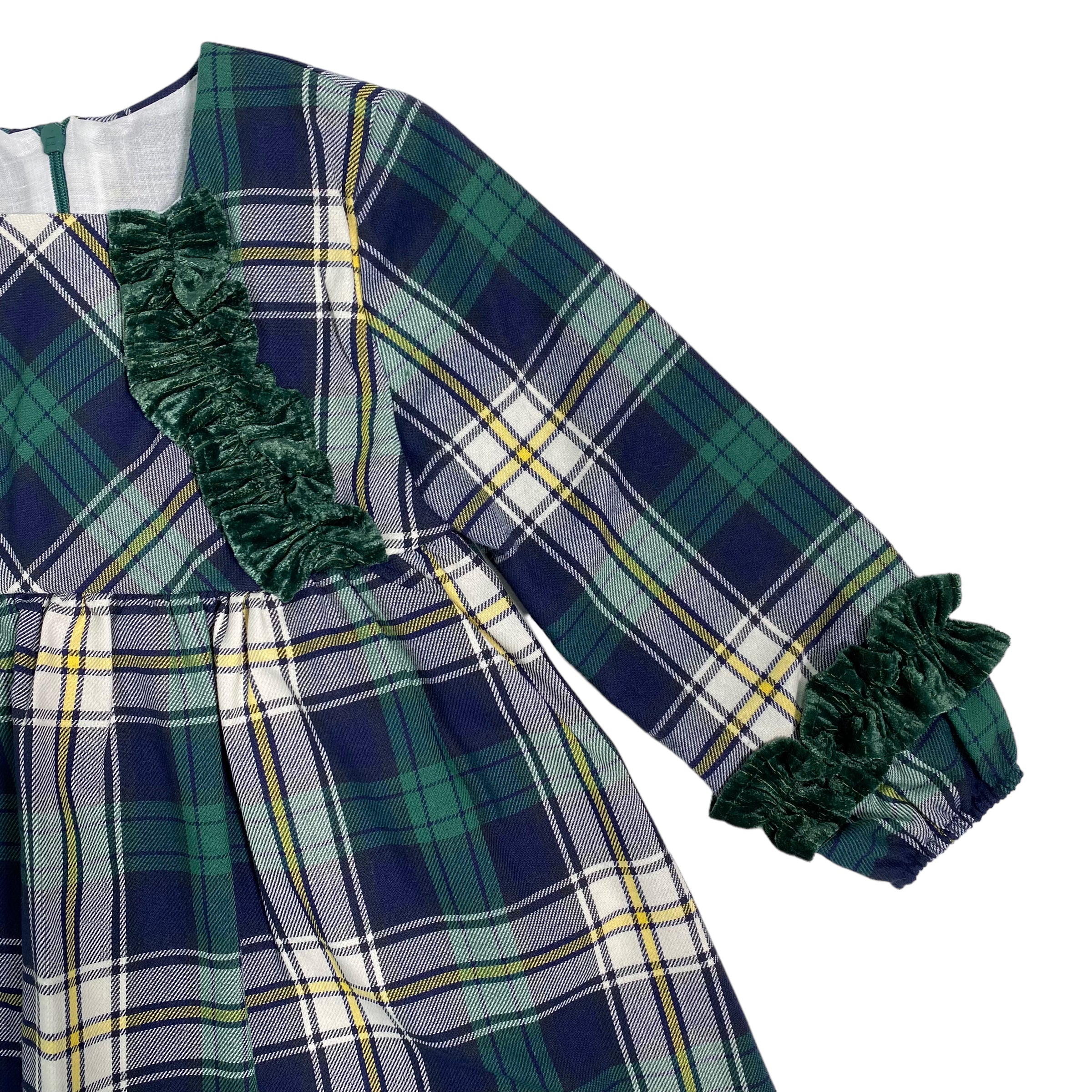 Abito svasato in caldo cotone, fantasia scozzese, con applicazione di rouches in velluto sul corpetto.