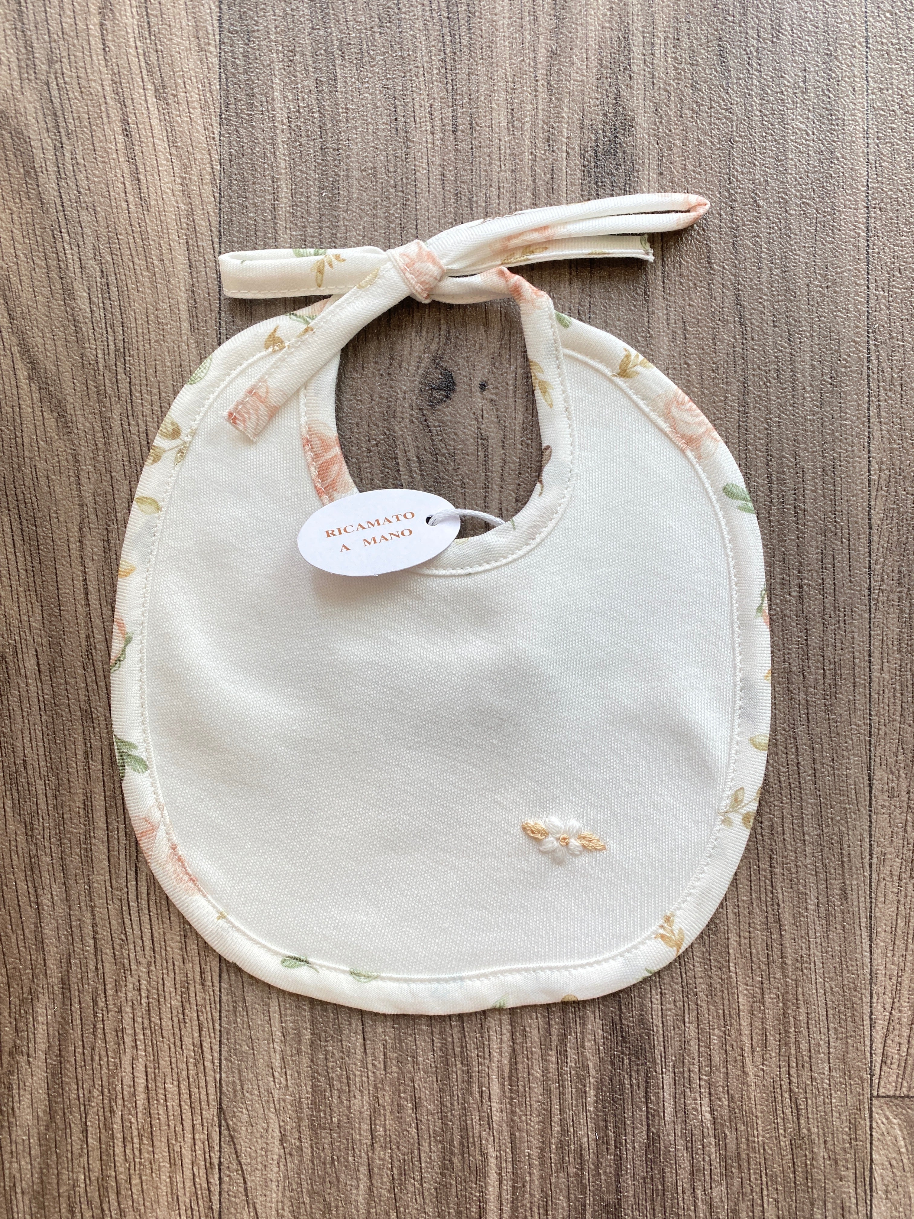 Bavetta in caldo cotone, con ricamo a mano sul davanti.