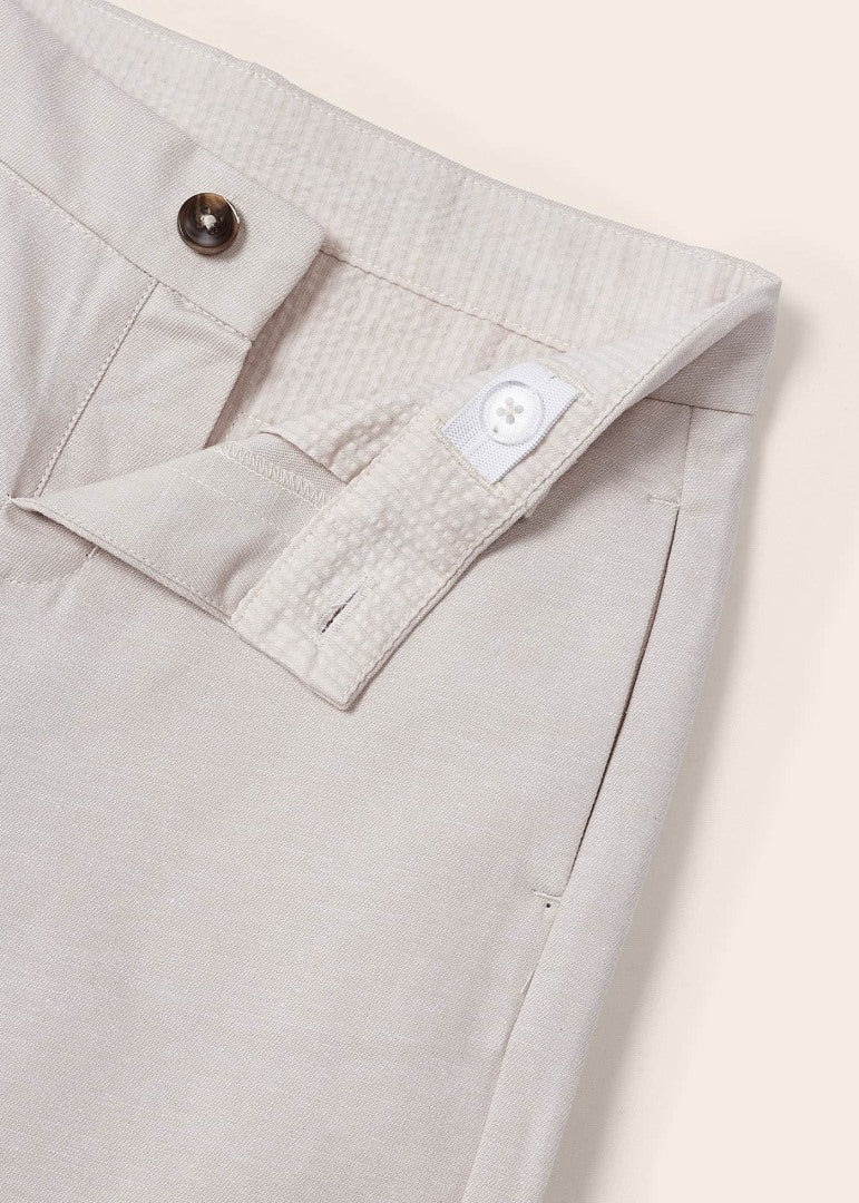 Pantalone corto modello bermuda per bambino. Chiusura con cerniera e bottone. Tessuto dall'aspetto fresco e moderno di lino. Tasche funzionali nella parte anteriore e posteriore del capo. Per motivi di sicurezza, nelle taglie piccole (2-5 anni) la cerniera è sostituita da una finta patta.