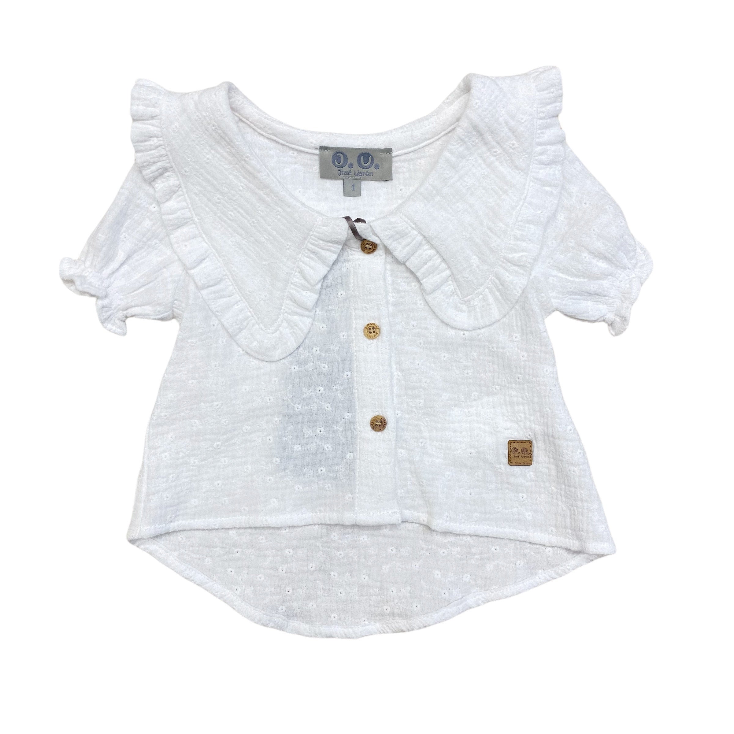 Blusa mezza manica per lei molto particolare, in garza con lavorazione in pizzo san gallo, bianco