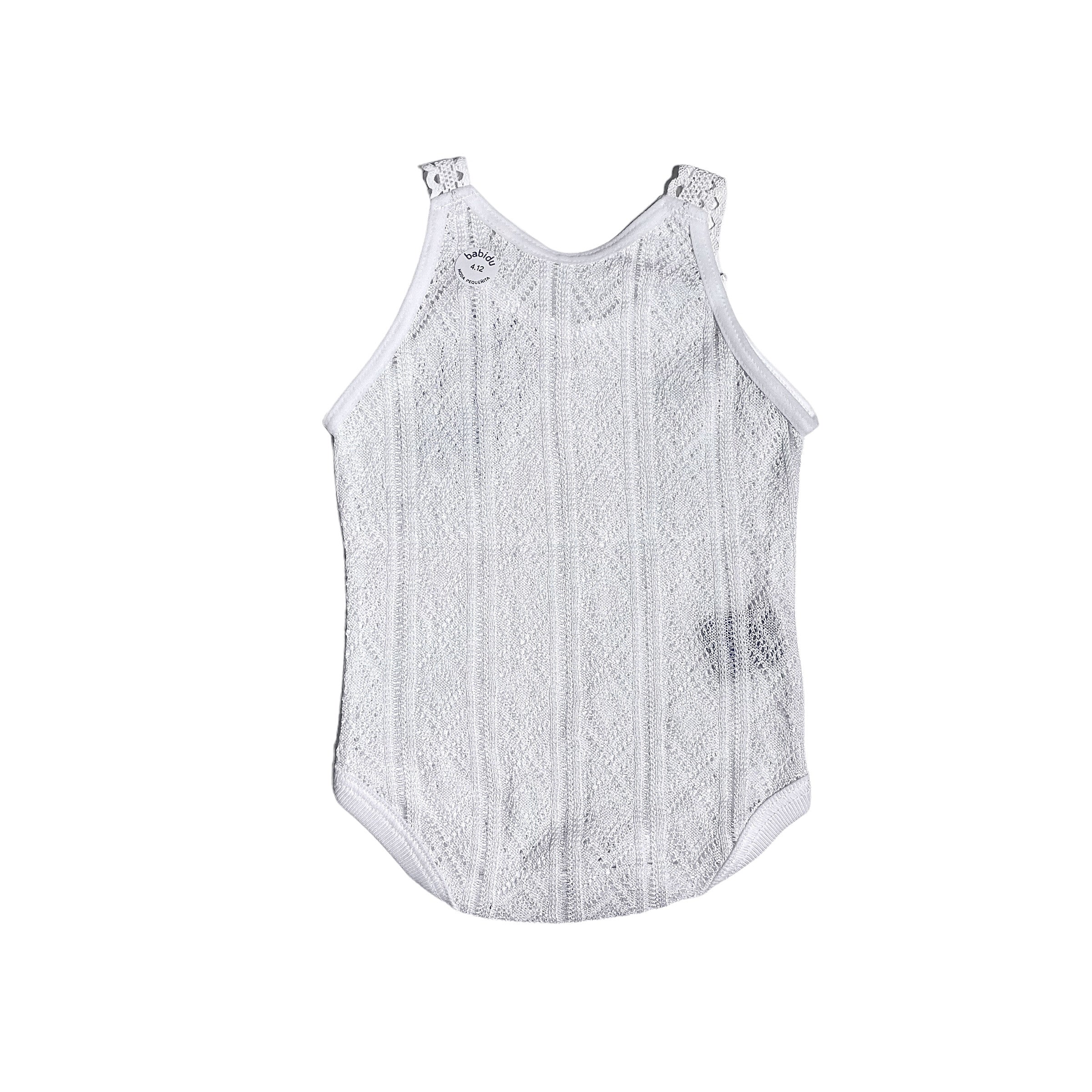 Questo body in filo di scozia per neonate è perfetto per le giornate estive grazie al suo design traforato a rombi che garantisce una perfetta traspirazione della pelle. Le bretelline e i dettagli in pizzo e i graziosi fiocchetti lo rendono elegante e pratico. Comodi bottoncini a clip per facilitare i cambi.
