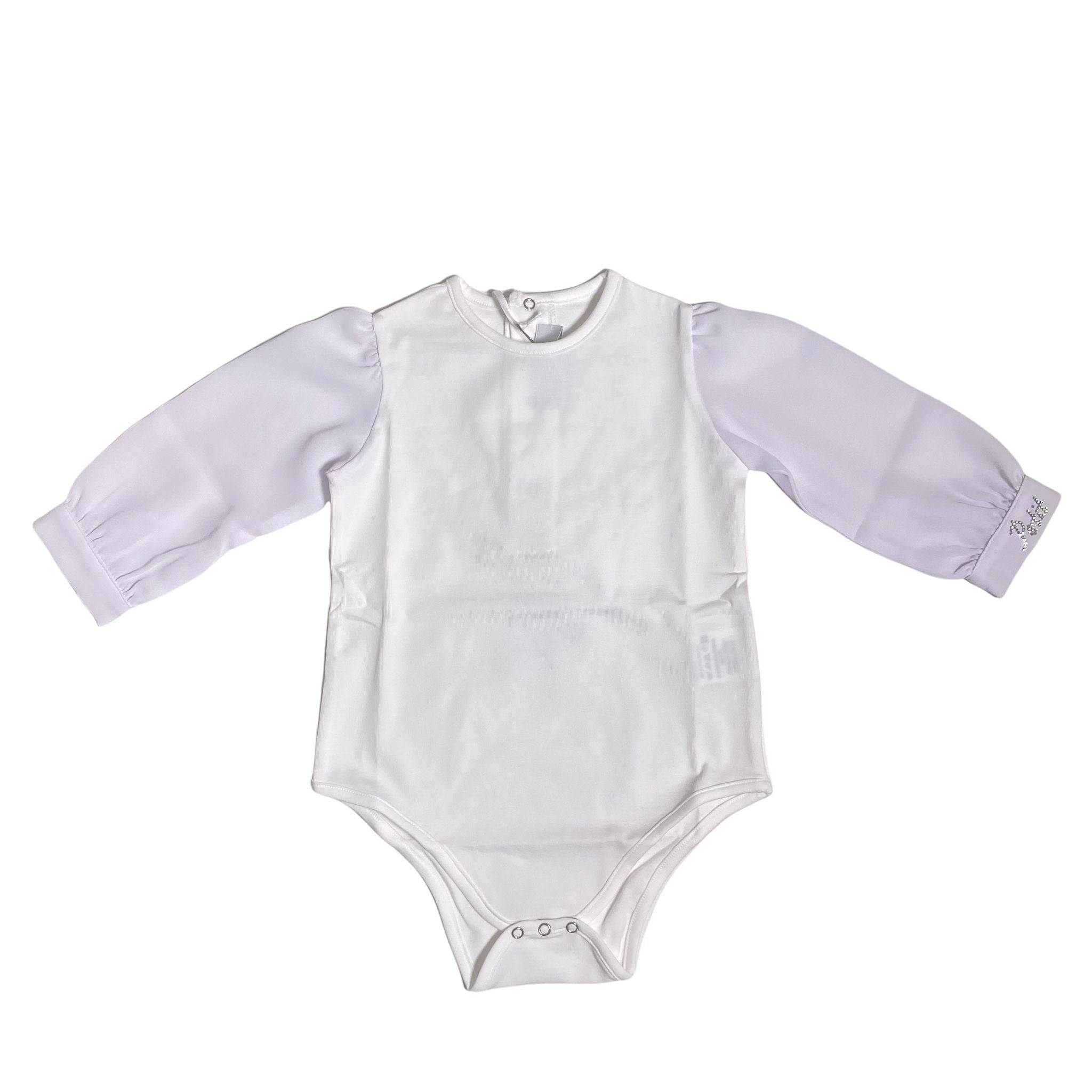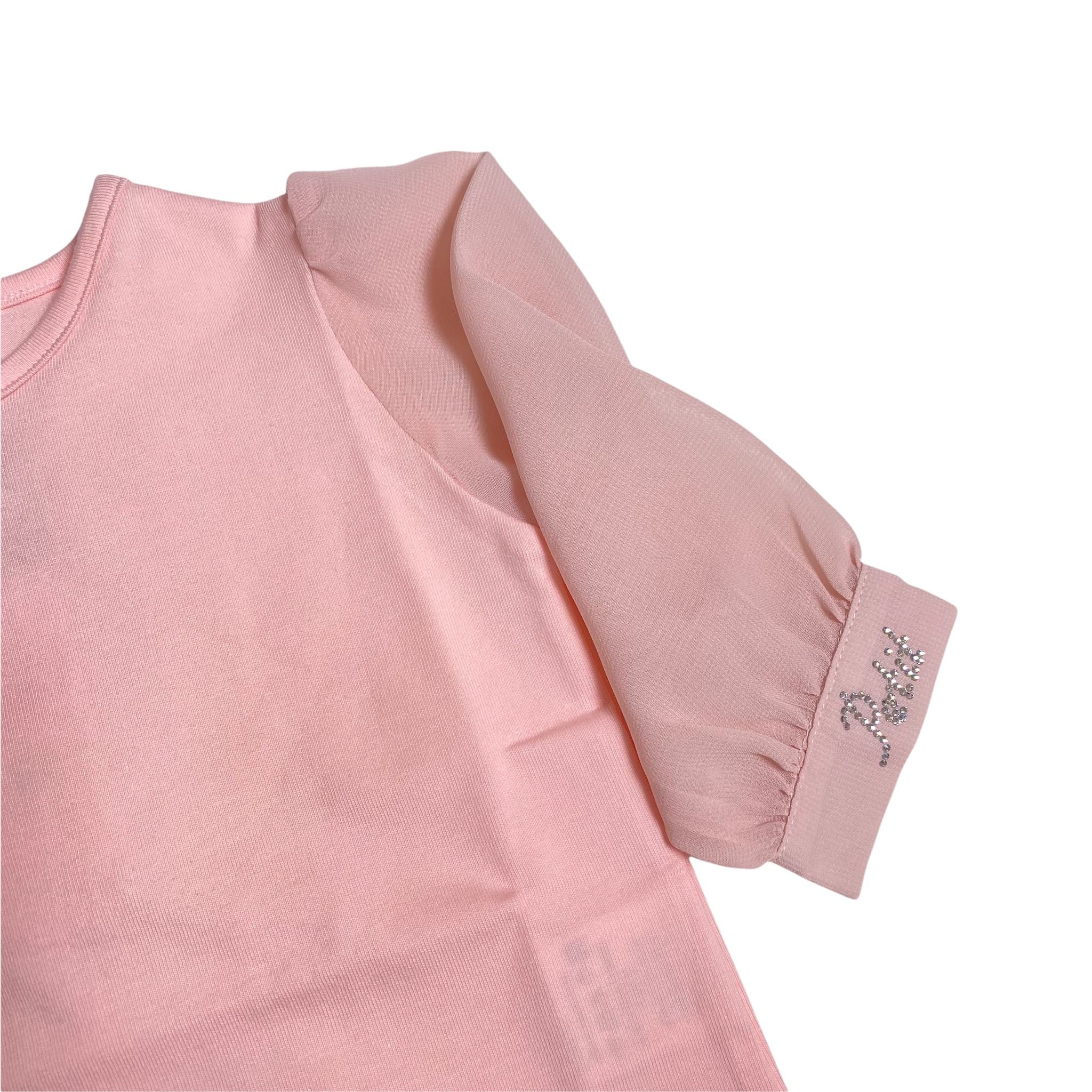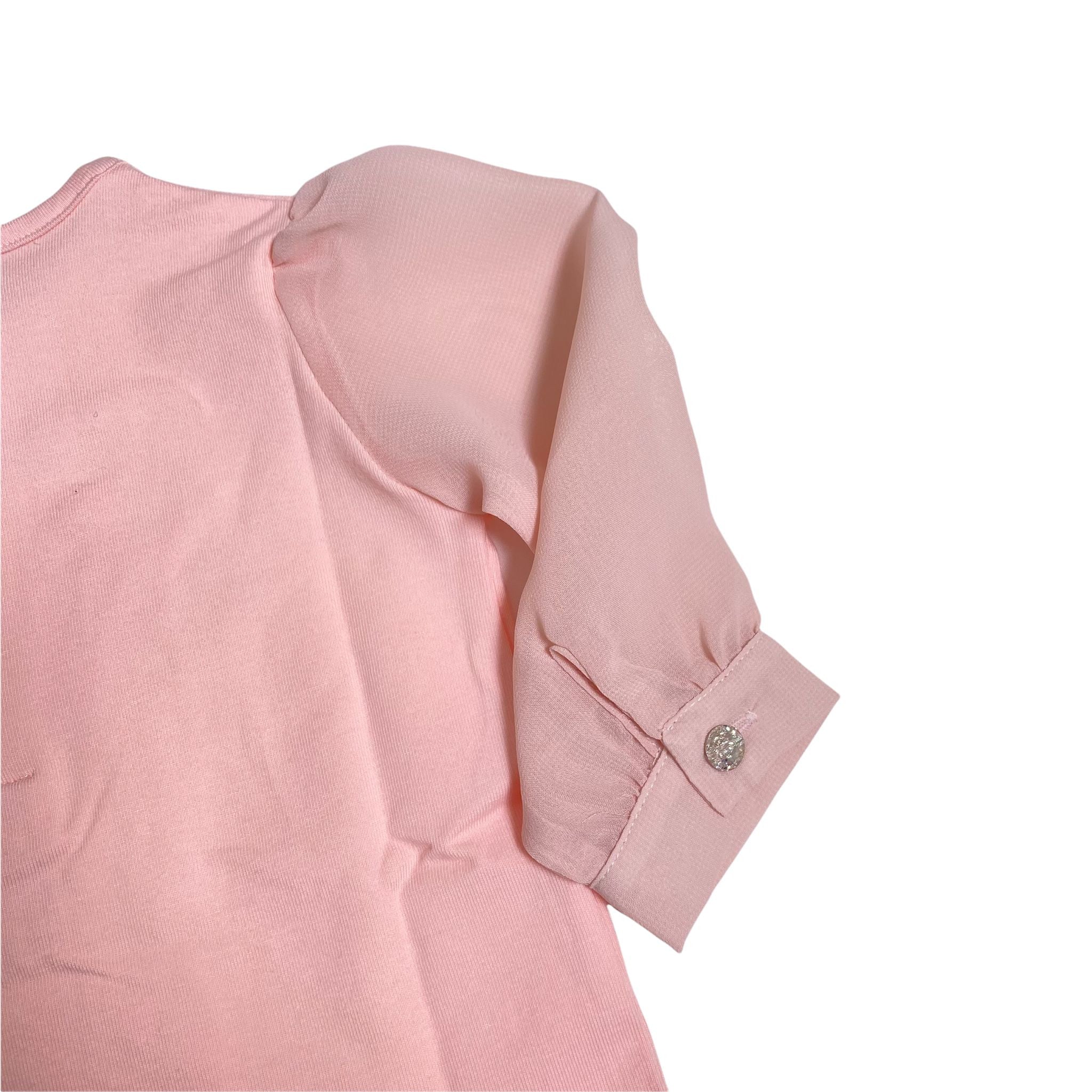 Body girocollo in cotone, in tinta unita, con manica in organza rosa e polsino con chiusura con bottone gioiello.