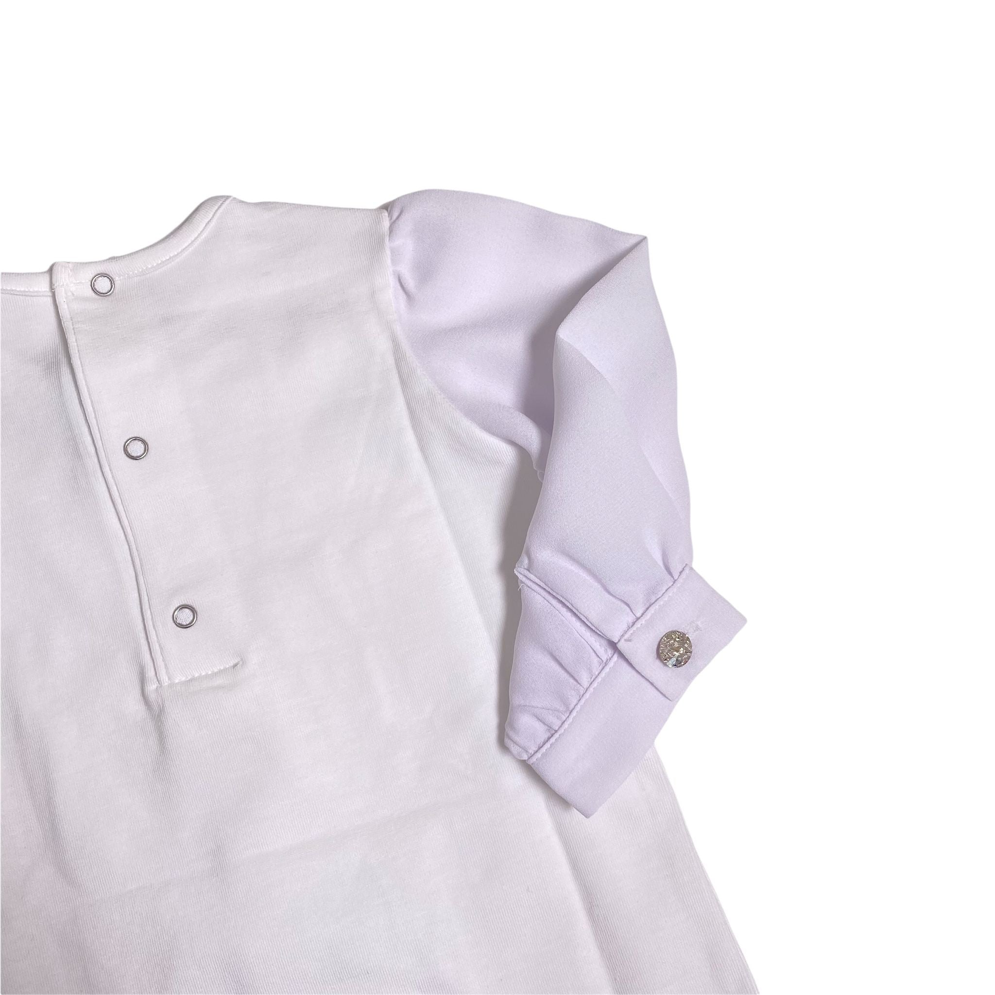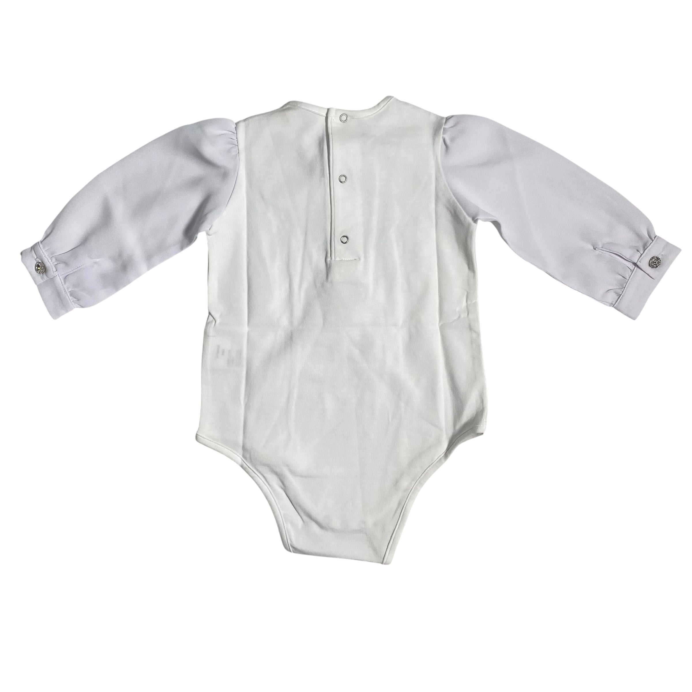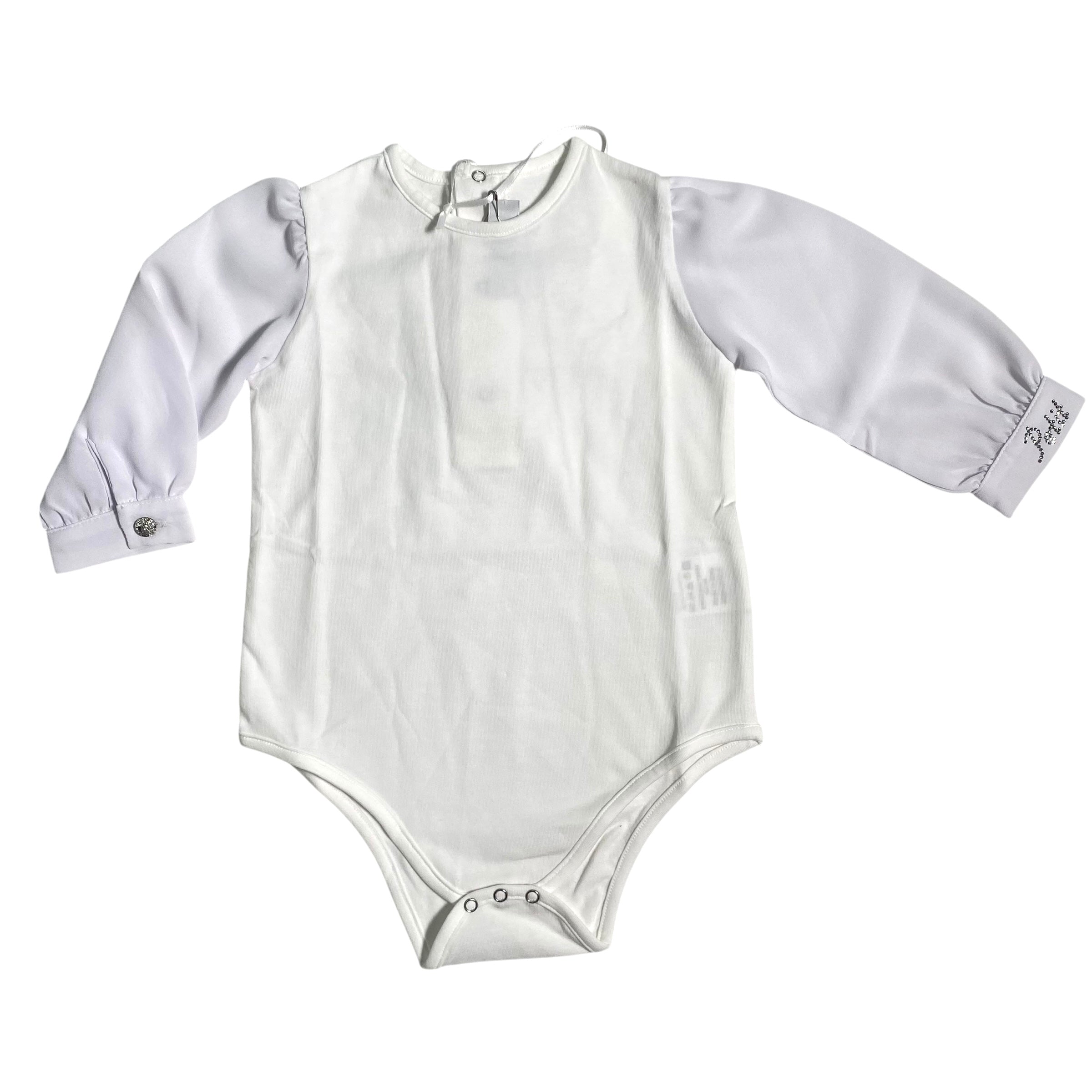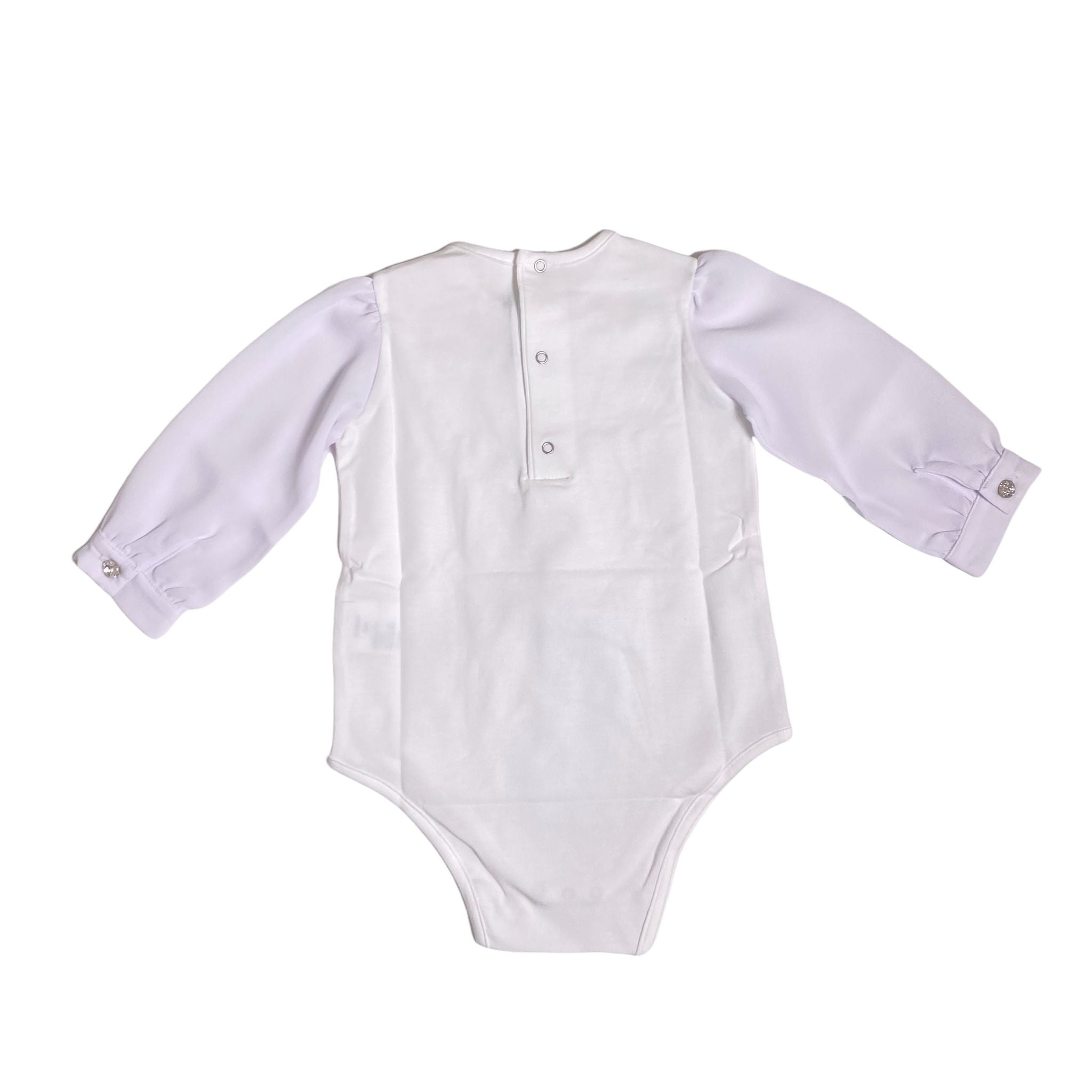 Body girocollo in cotone, in tinta unita, con manica in organza rosa e polsino con chiusura con bottone gioiello.