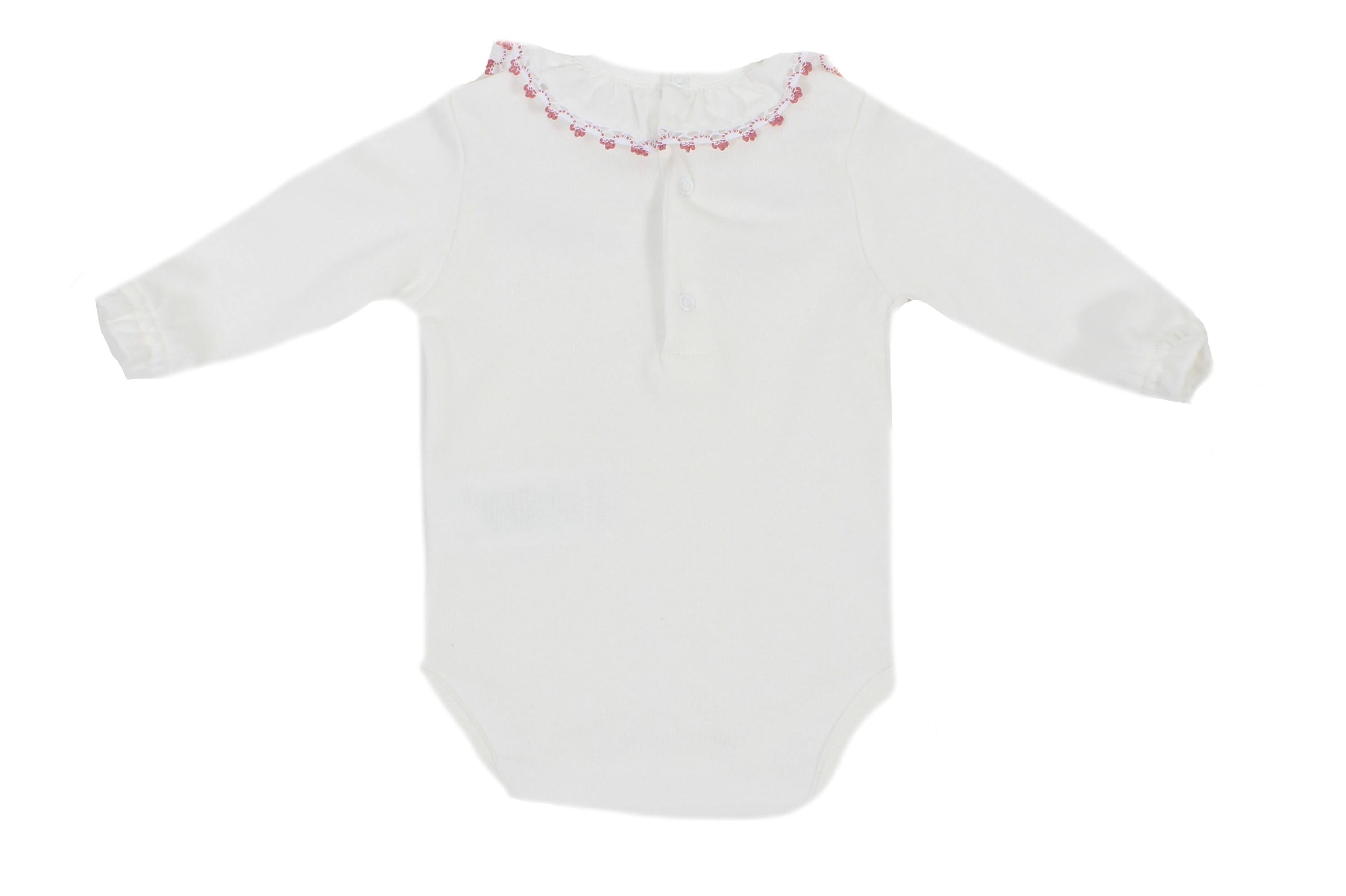 Body a maniche lunghe con volante al girocollo con chiusura al cavallo e sulla schiena con bottoni a pressione.