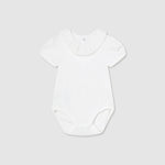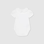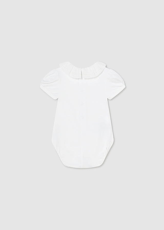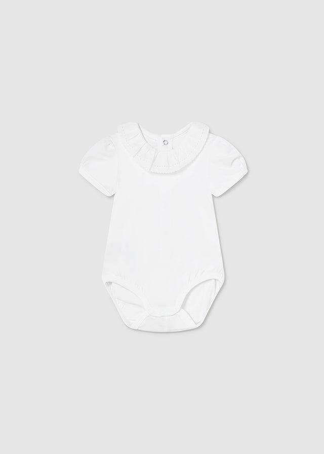 Body manica corta per neonato. Colletto modello volant. Chiusura con bottoni a pressione nella parte posteriore che facilitano la vestibilità del capo. Chiusura con bottoni a pressione nell'interno cosce per agevolare la vestibilità.
