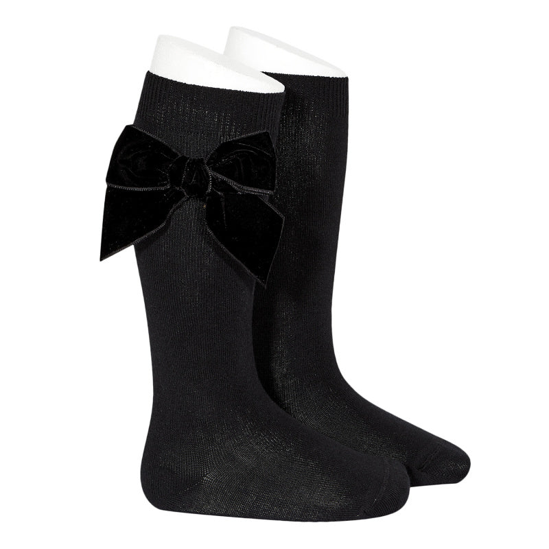 Calze lunghe in caldo cotone a maglia rasata con grande fiocco in velluto.