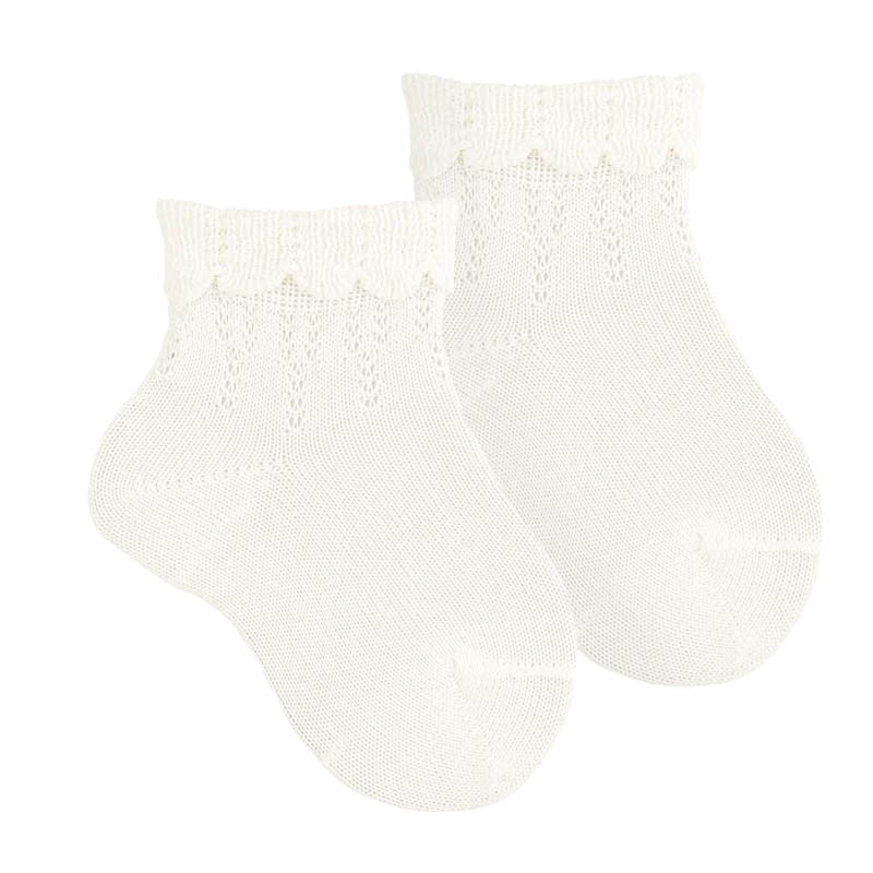 Calzini corti da cerimonia da neonato in cotone. Polsino risvoltato e dettaglio verticale traforati.