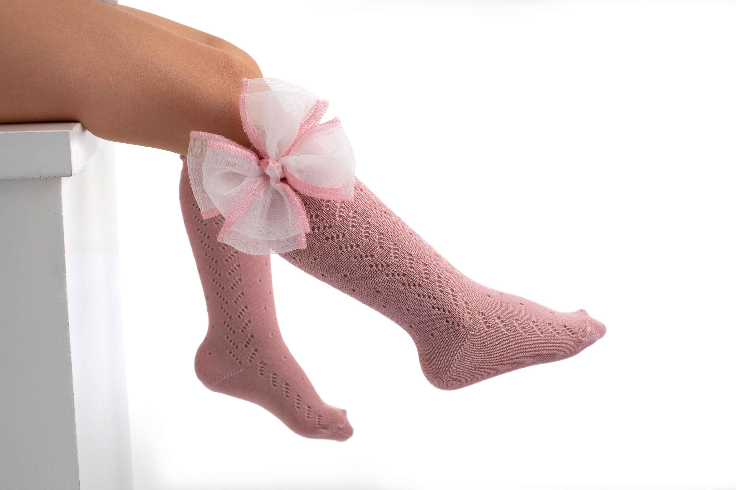 Calzini in filo di cotone lunghi traforati con fiocco in tulle laterale.