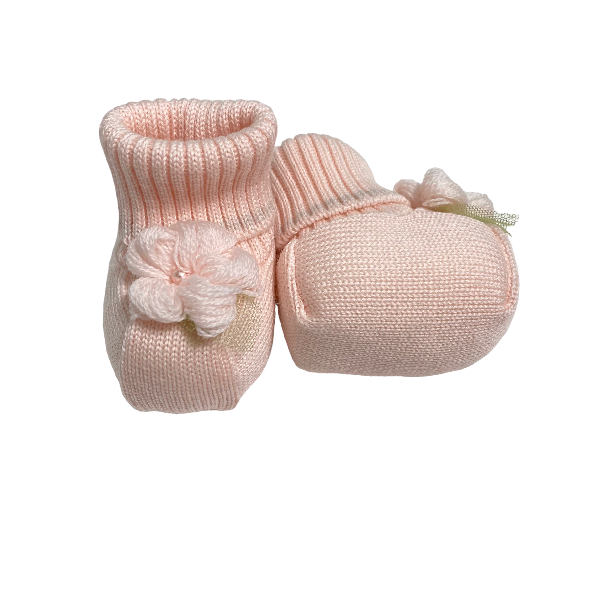 Calzini scarpetta in pura lana 100%, in tinta unita rosa, con fiori in lana sul davanti.