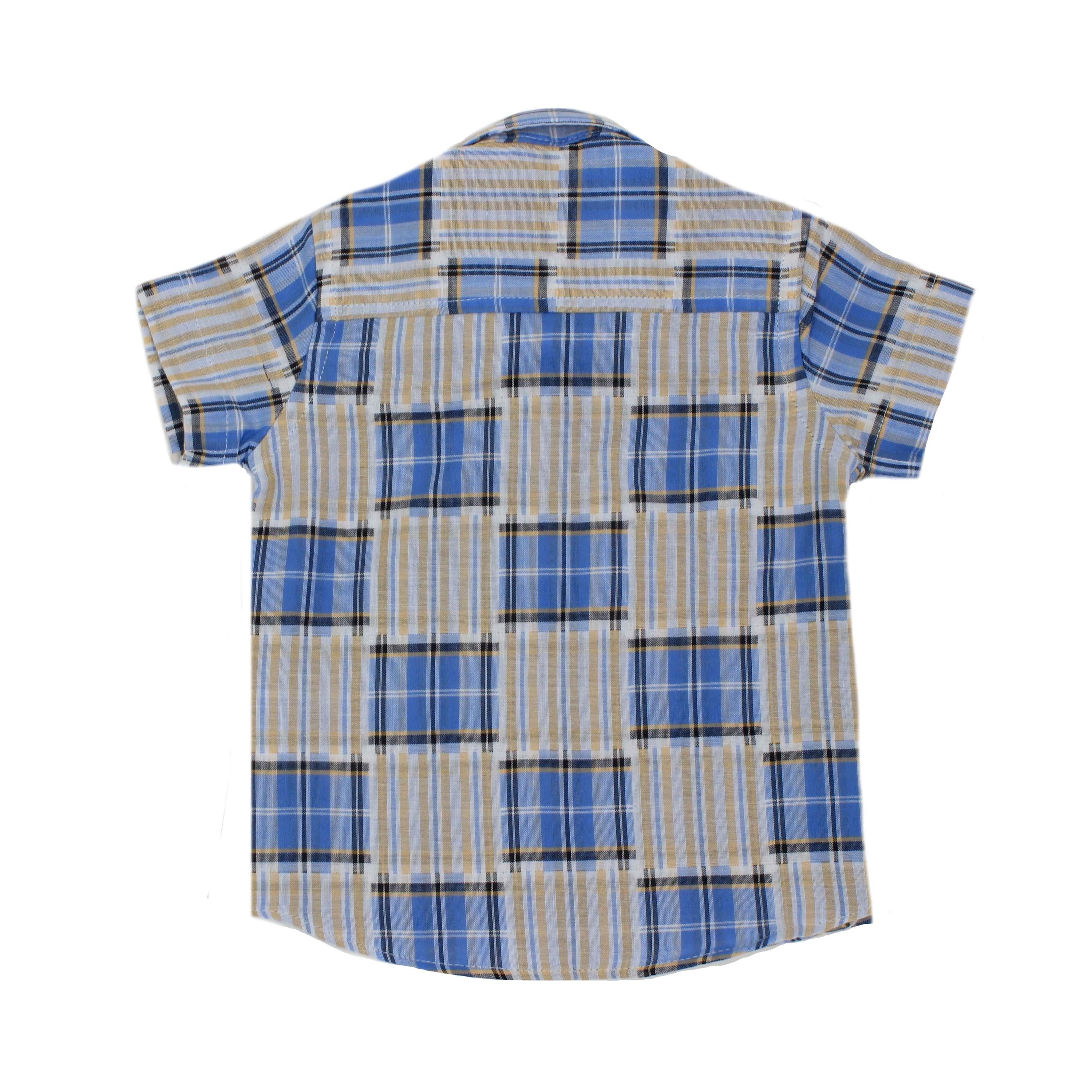 Camicia Mezza Manica In Cotone. Fantasia a Quadroni Senape, Azzurro e Panna