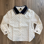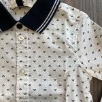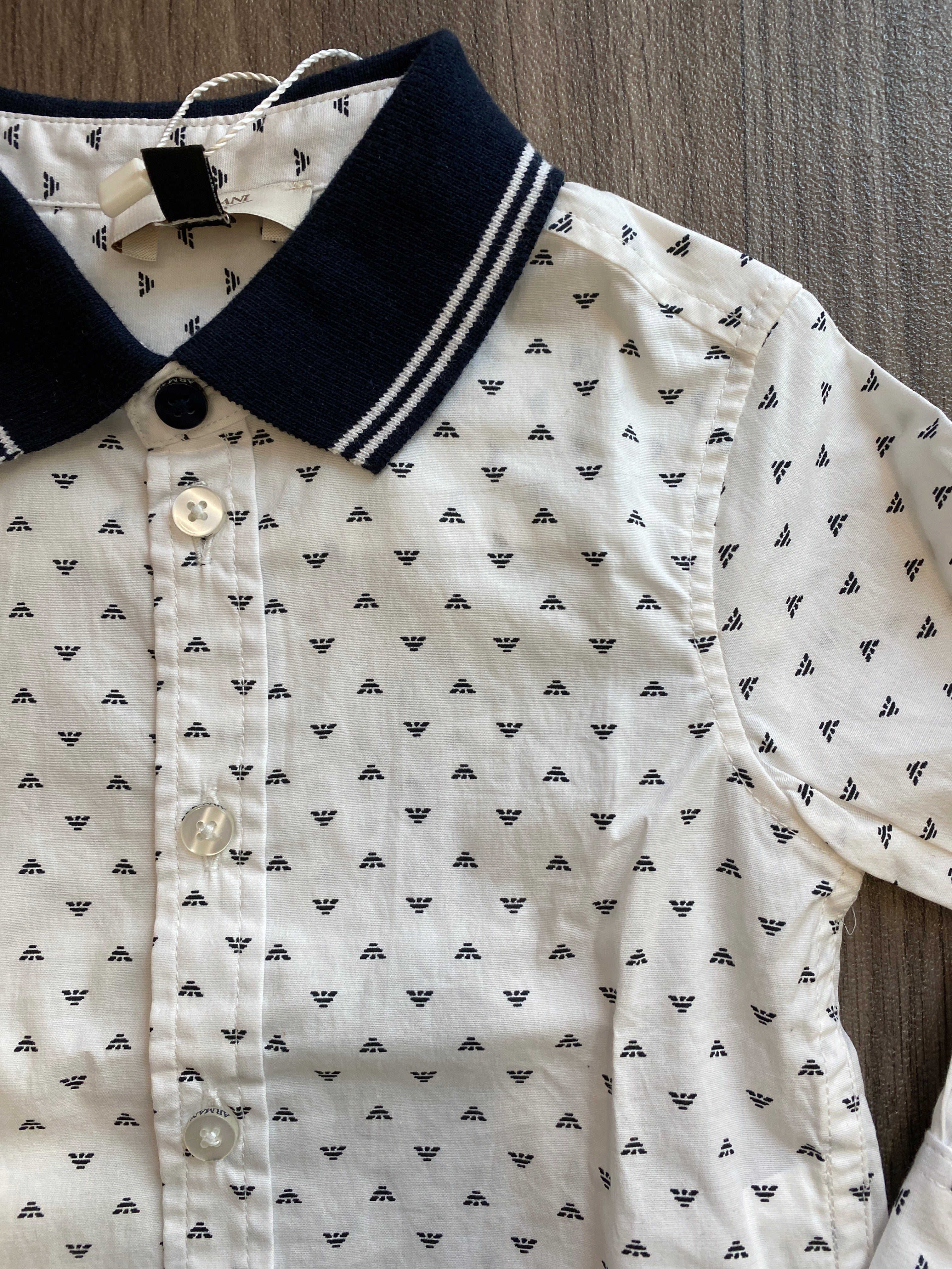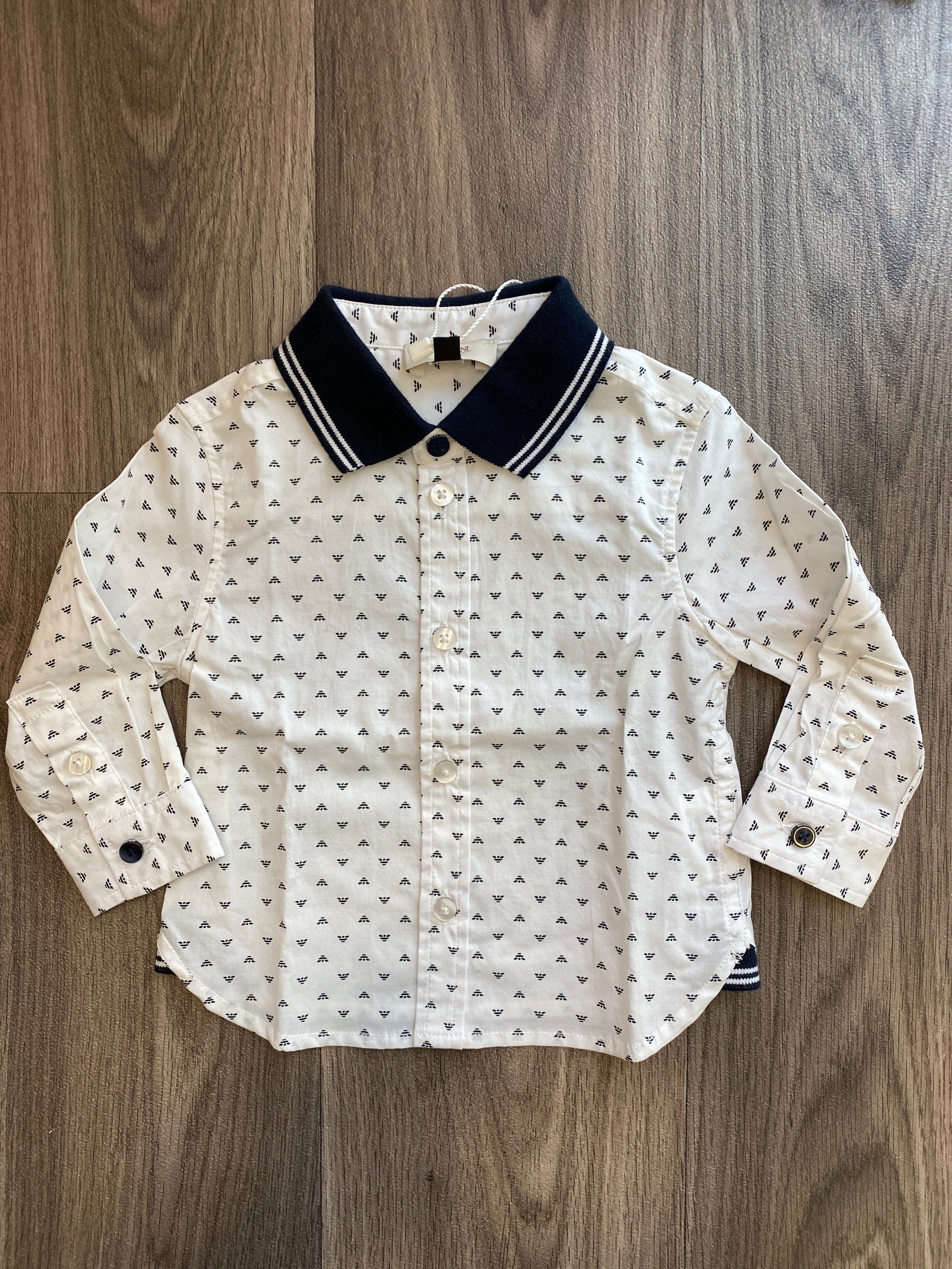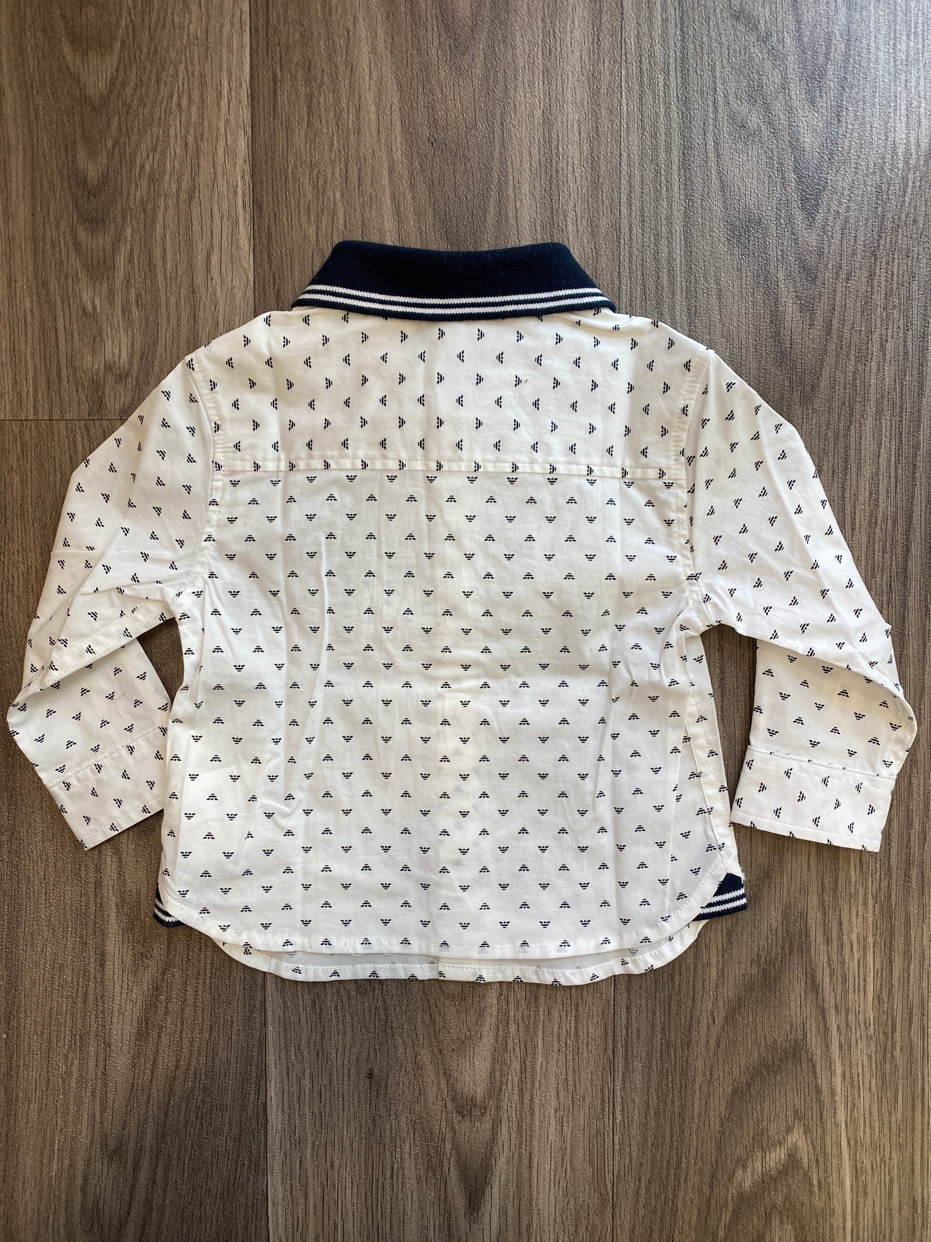 Freschissima camicia in cotone maniche lunghe, base bianca e fantasia con loghetti Armani colletto a righe blu e bianco