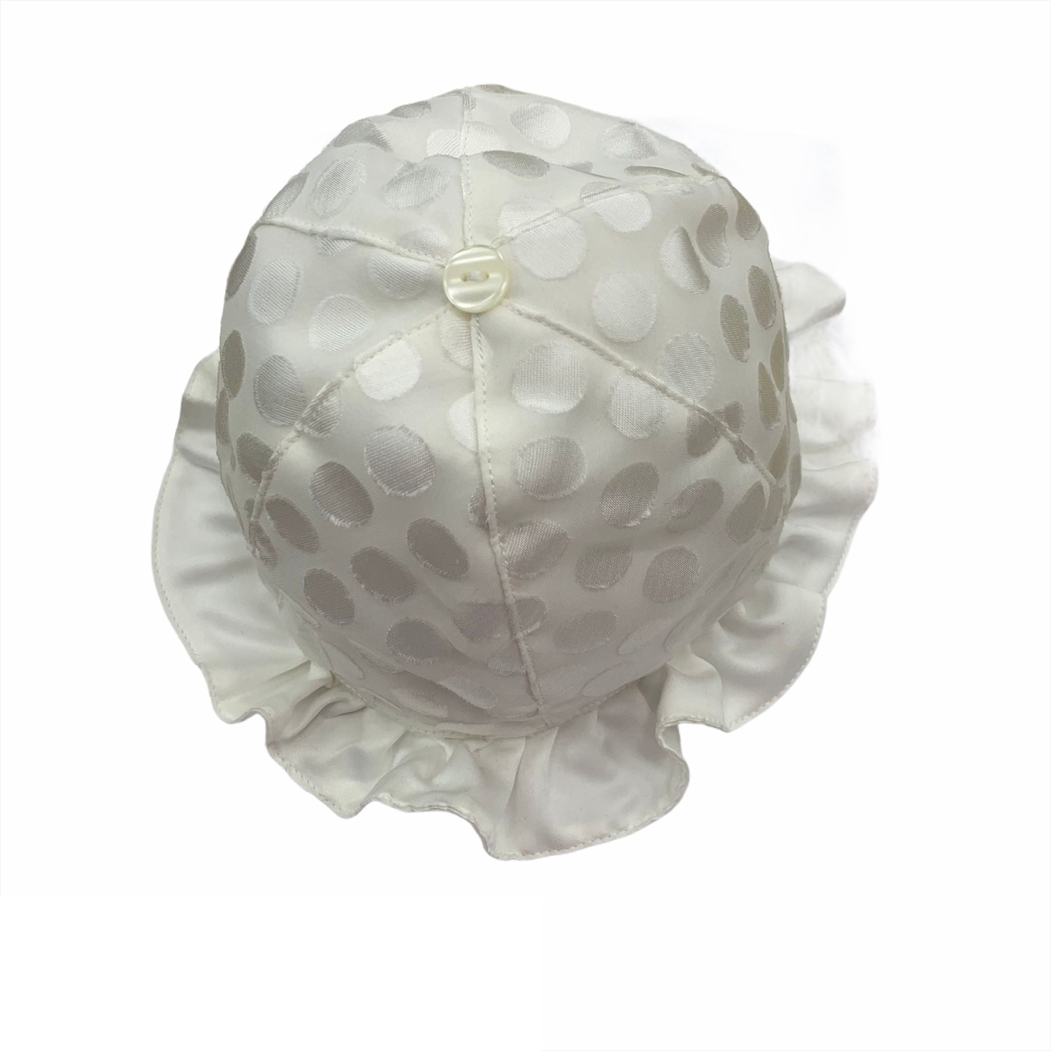 Cappello elegante in raso panna doppiato in organza a pois. Volant intorno.