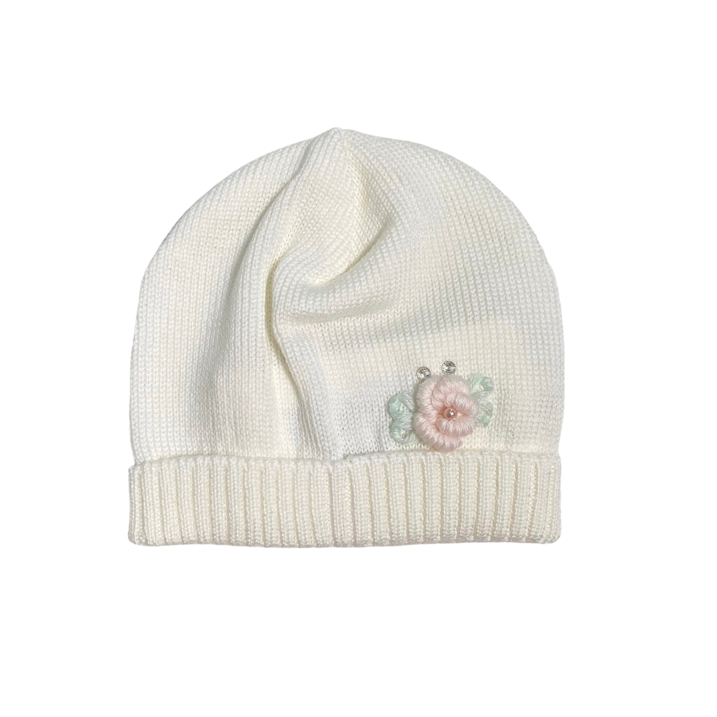 Cappello in pura lana 100% con risvolto e ricamo sul davanti, in tinta unita panna.
