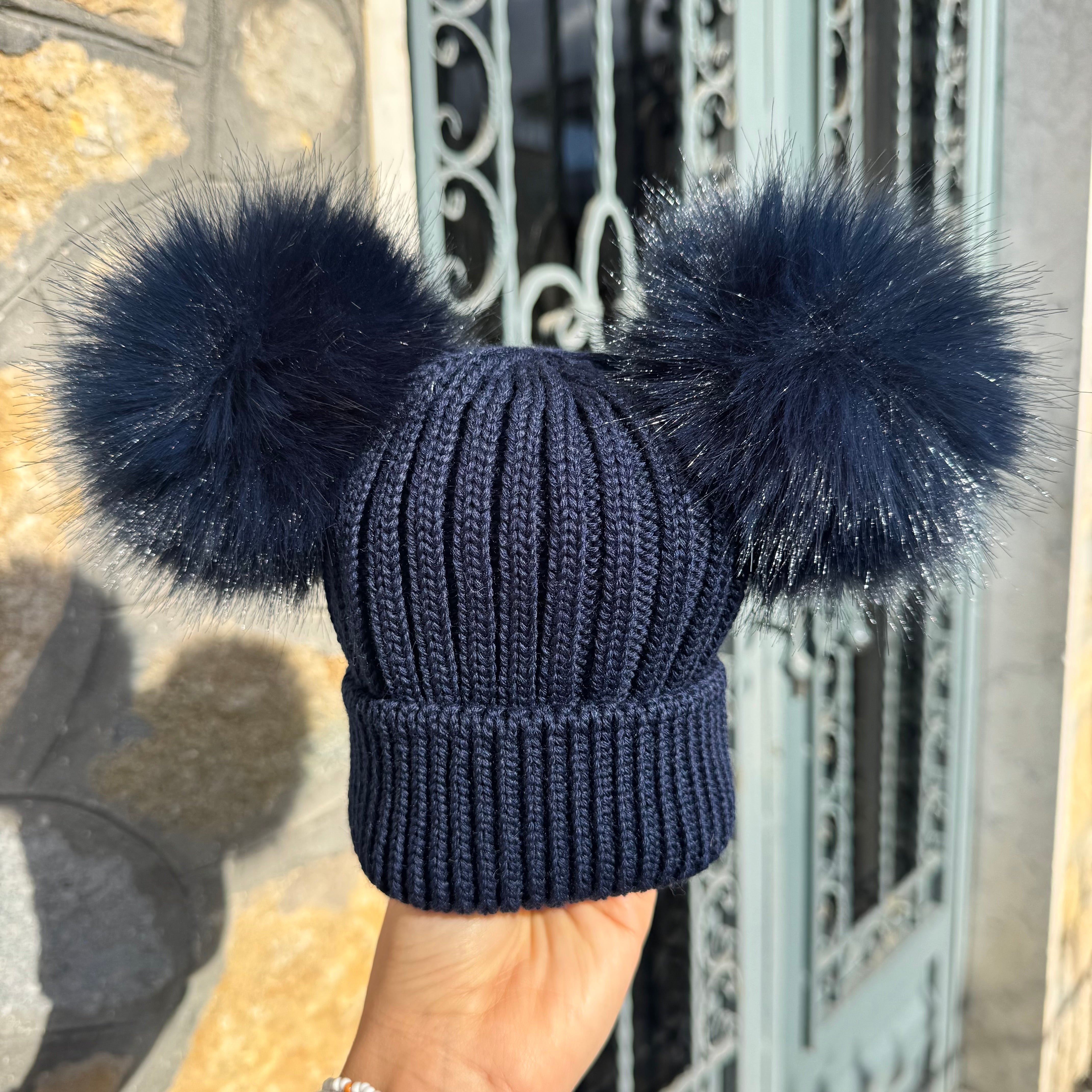 Cappello in misto lana a coste con risvolto, con doppio pom pon ecologico.