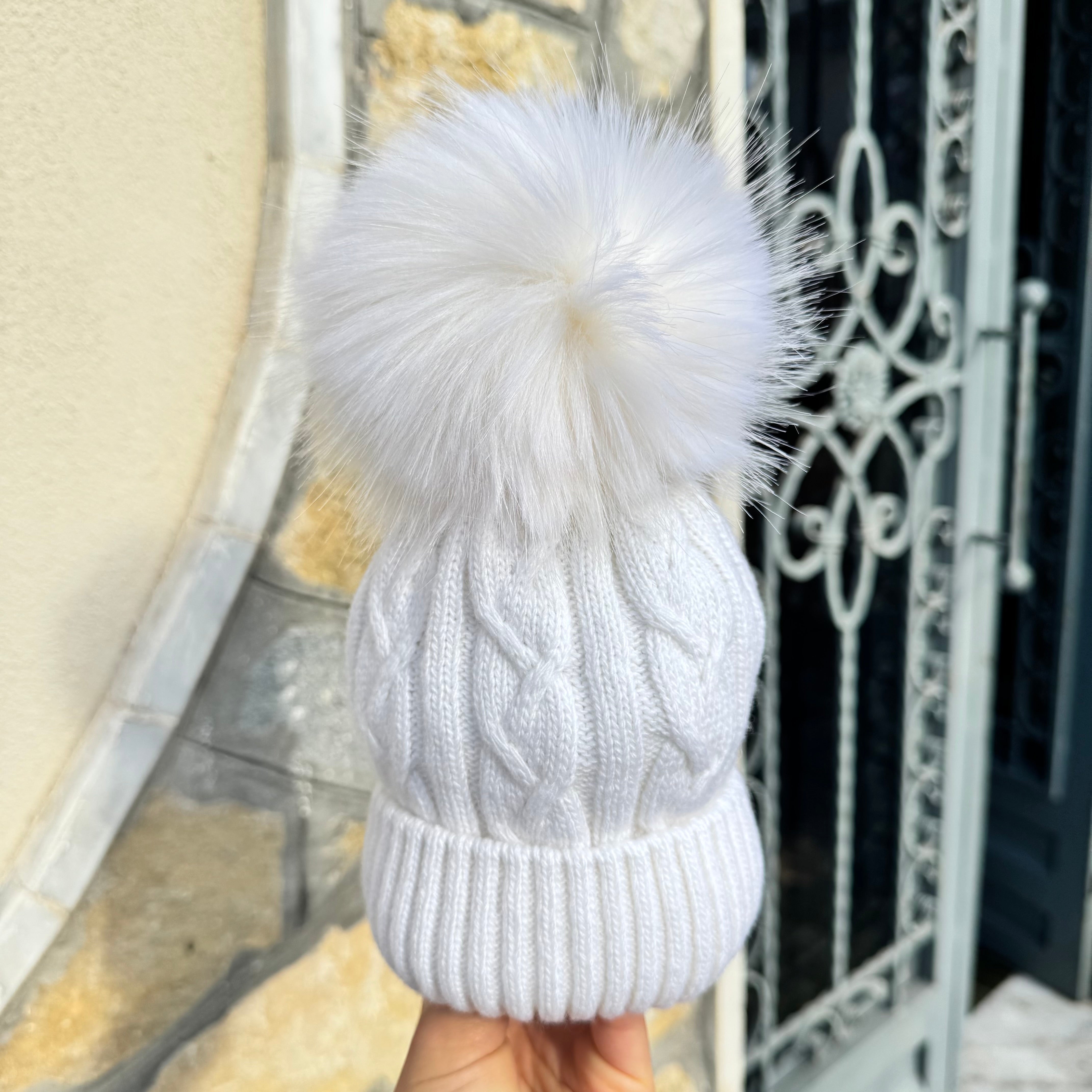 Cappello in misto lana e cashmire con trecce, risvolto e pom pon in ecopelliccia.