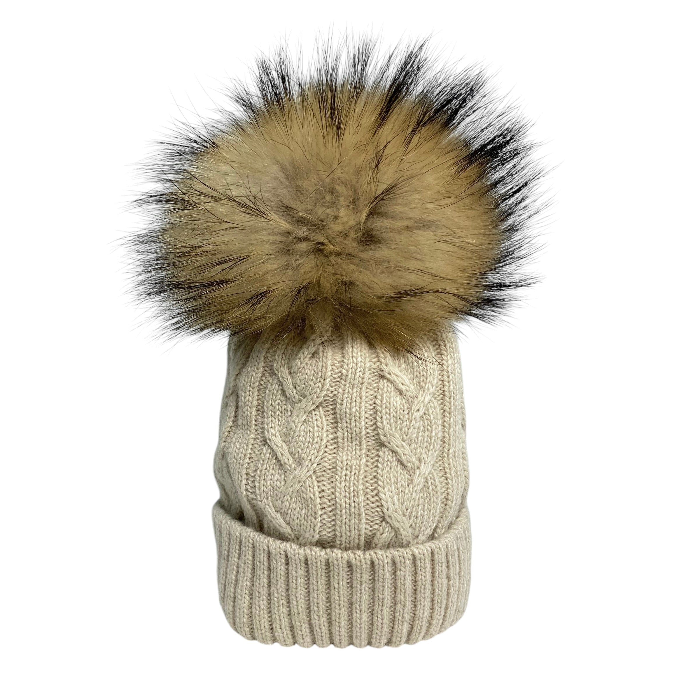 Cappello in misto lana e cashmire con trecce, risvolto e pom pon in pelliccia originale.