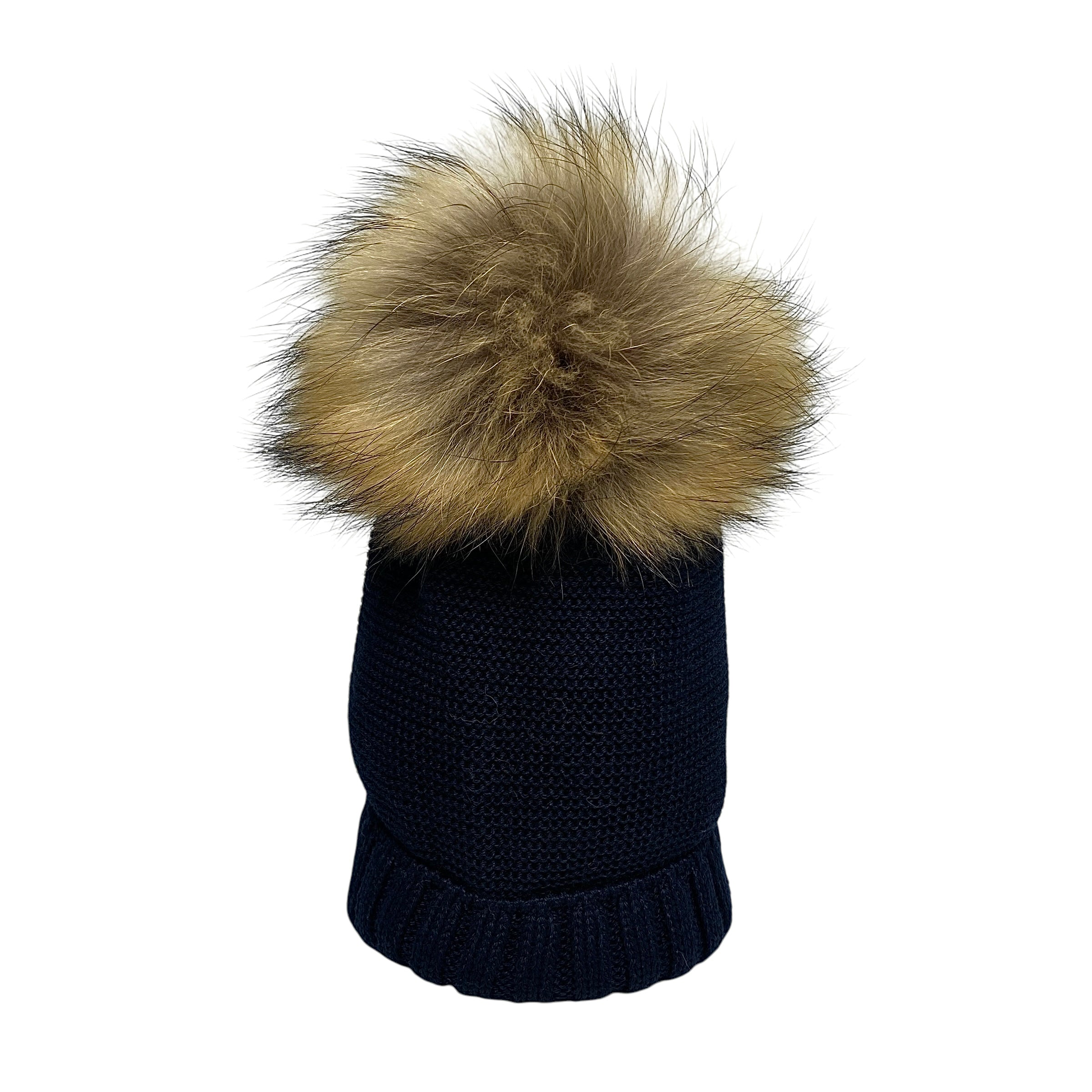 Cappello in misto lana con trama di trecce, con risvolto e pom pon in pelliccia originale murmasky.