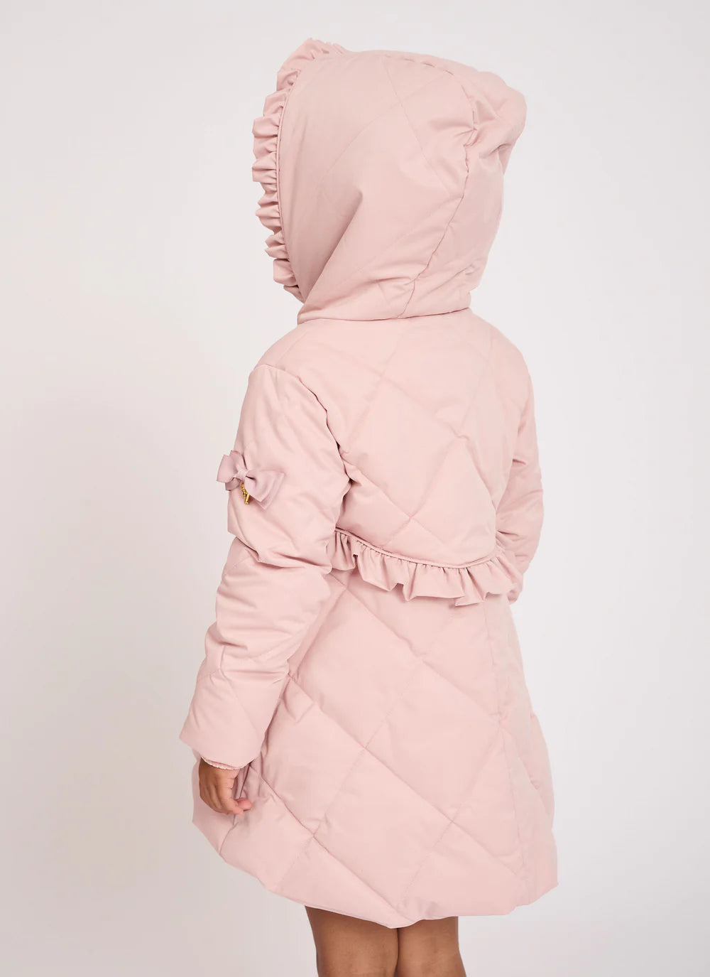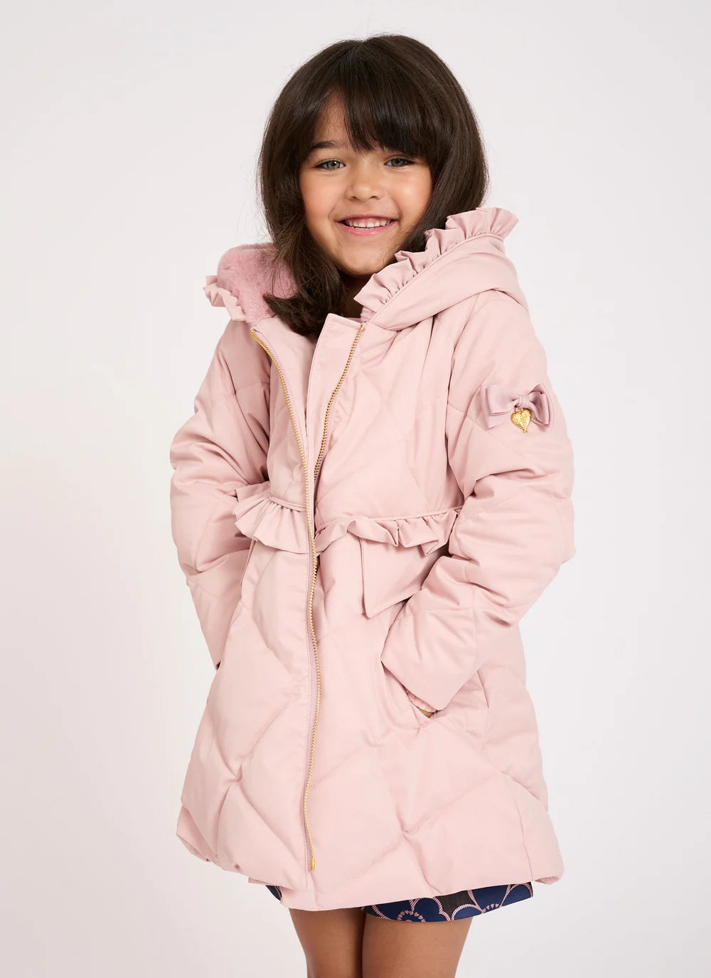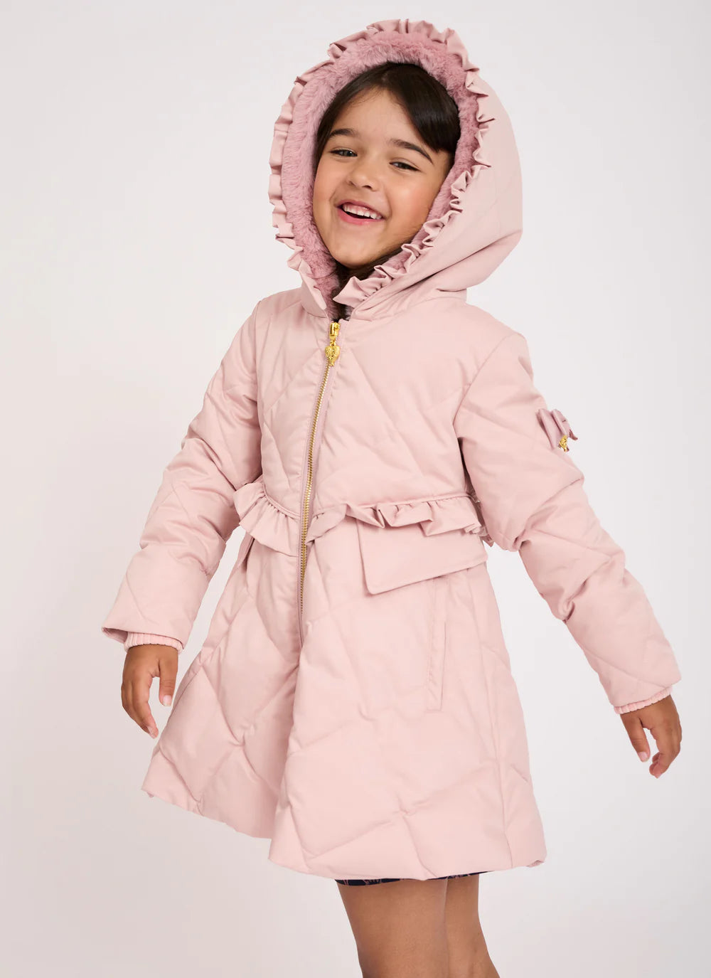 Splendido cappotto invernale beige per ragazze con dettaglio di volant intorno al cappuccio e alla vita. Realizzato con il nostro lussuoso capospalla con un design trapuntato a rombi, il corpo è foderato in morbido raso e pelliccia sintetica nel cappuccio. Il cappotto è dotato di comode tasche, un bellissimo orlo peplo e chiusura sul davanti con la nostra iconica cerniera dorata. Il cappotto è completo del nostro caratteristico fiocco e del ciondolo a forma di cuore dorato sul braccio.