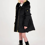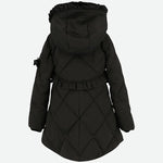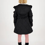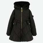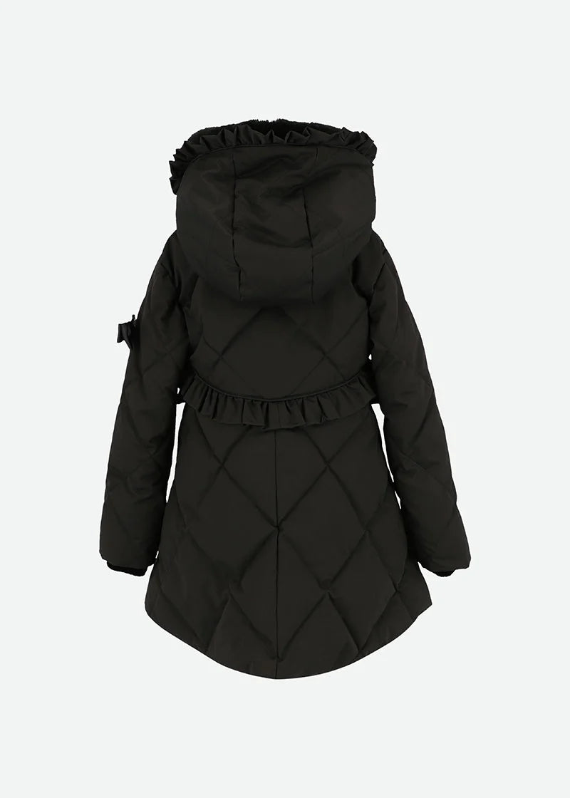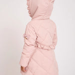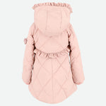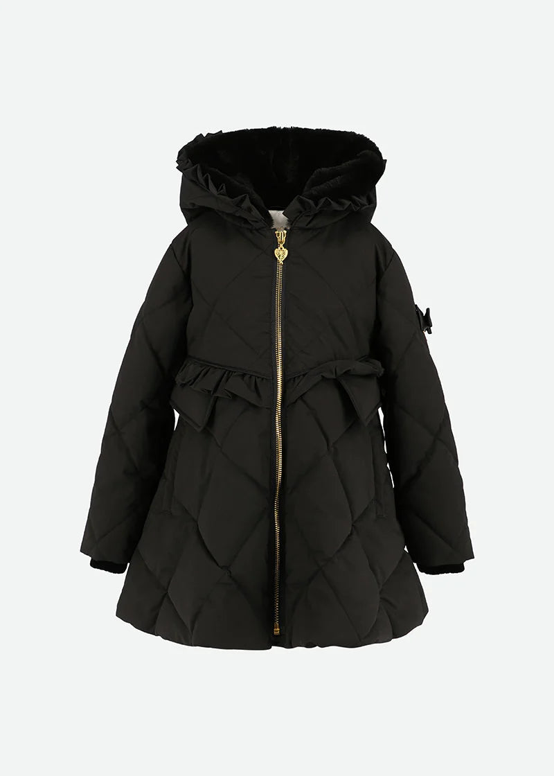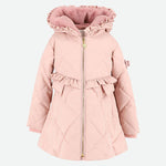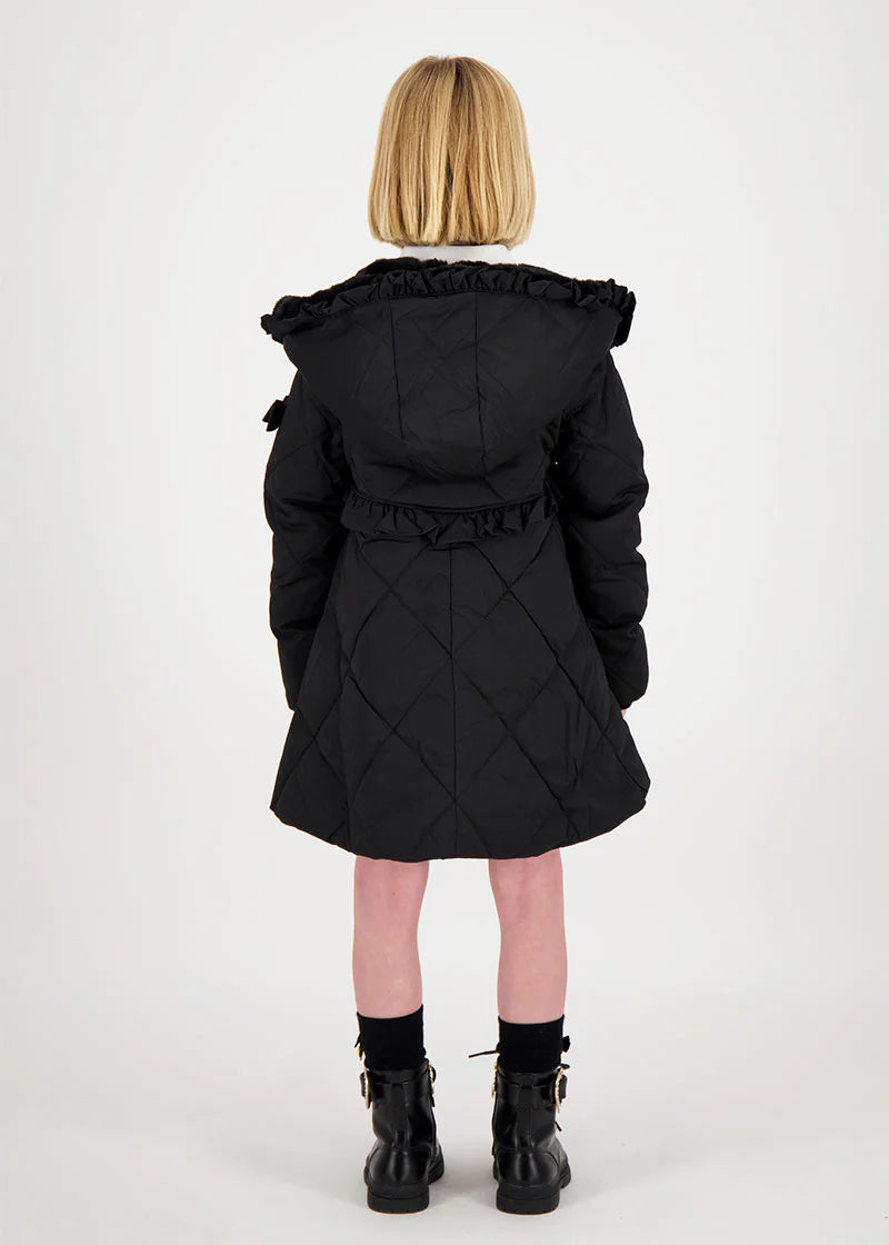 Splendido cappotto invernale beige per ragazze con dettaglio di volant intorno al cappuccio e alla vita. Realizzato con il nostro lussuoso capospalla con un design trapuntato a rombi, il corpo è foderato in morbido raso e pelliccia sintetica nel cappuccio. Il cappotto è dotato di comode tasche, un bellissimo orlo peplo e chiusura sul davanti con la nostra iconica cerniera dorata. Il cappotto è completo del nostro caratteristico fiocco e del ciondolo a forma di cuore dorato sul braccio.