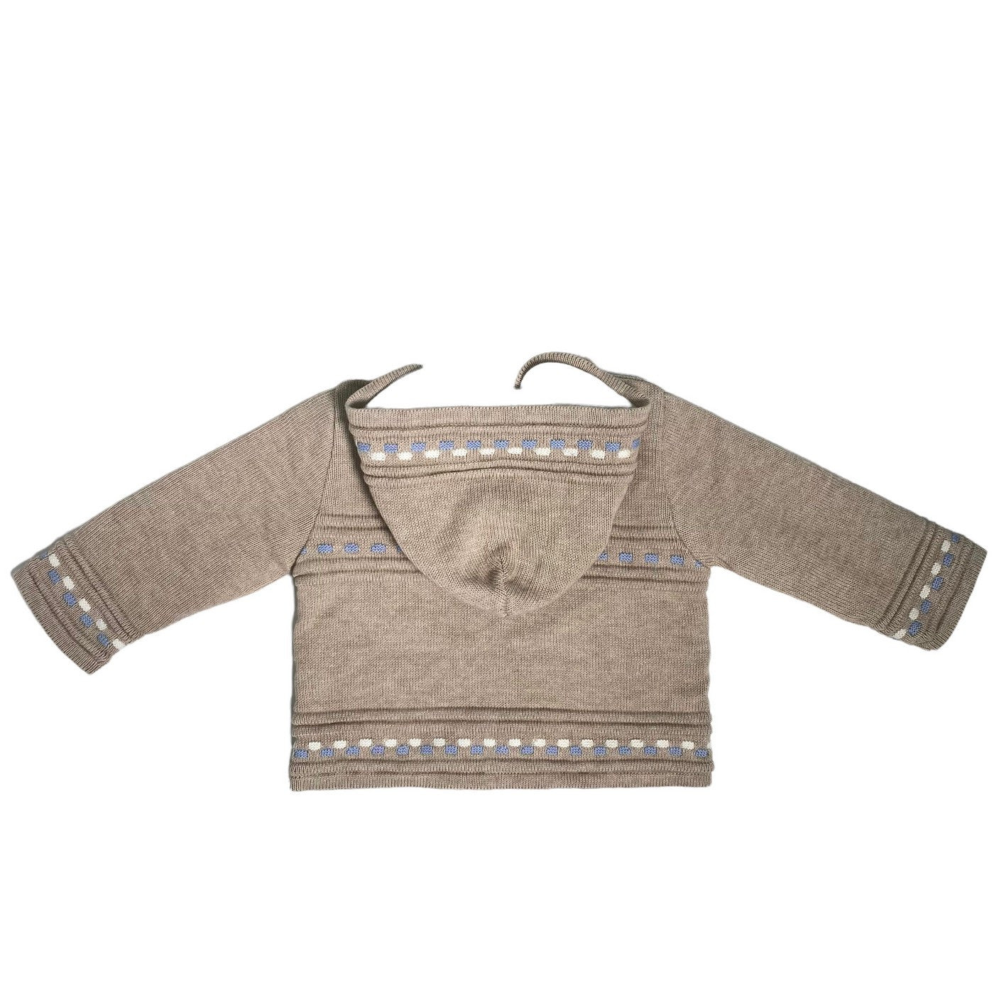 Cappotto in misto lana foderato internamente in pile, con cappuccio e cordoncini in lana celesti e panna.
