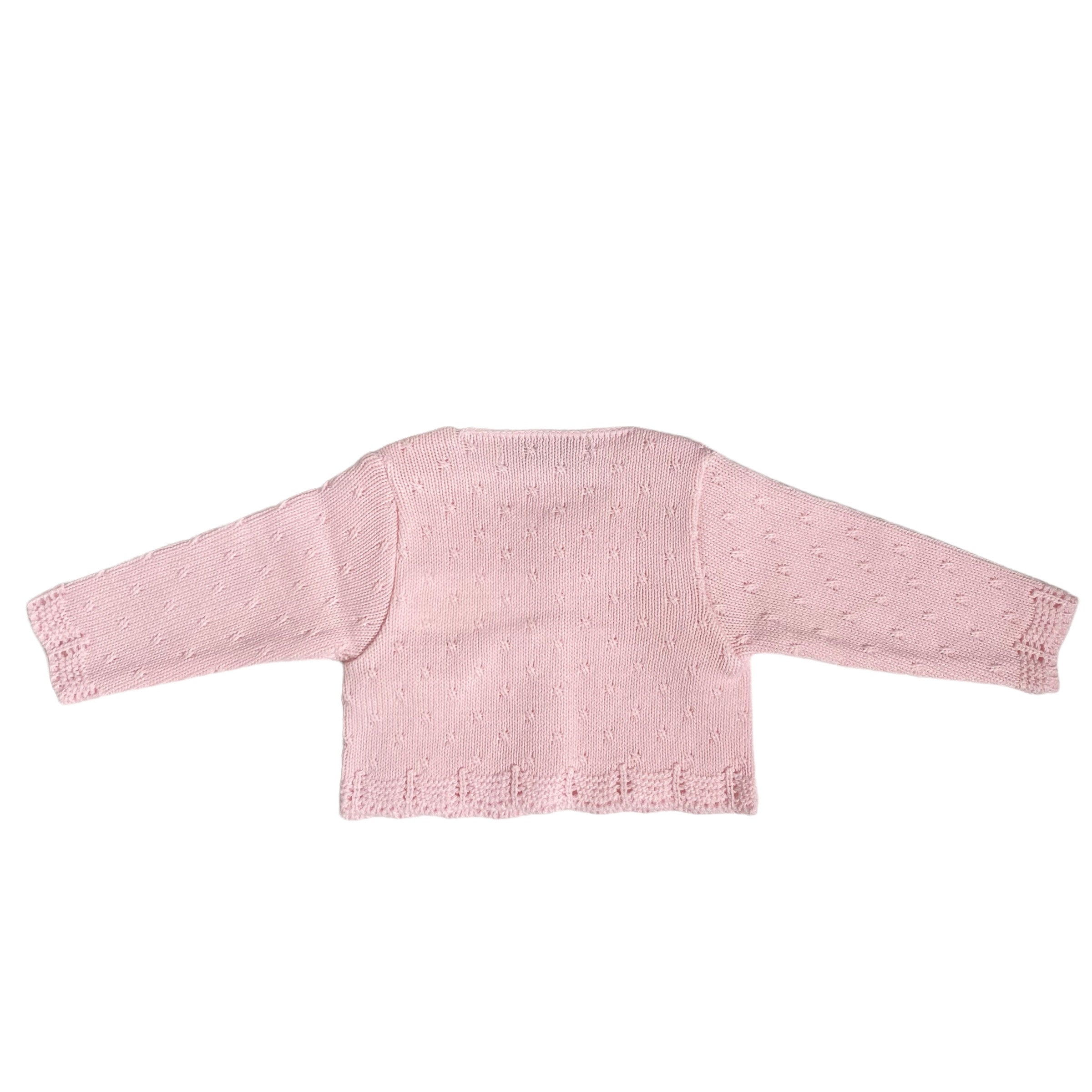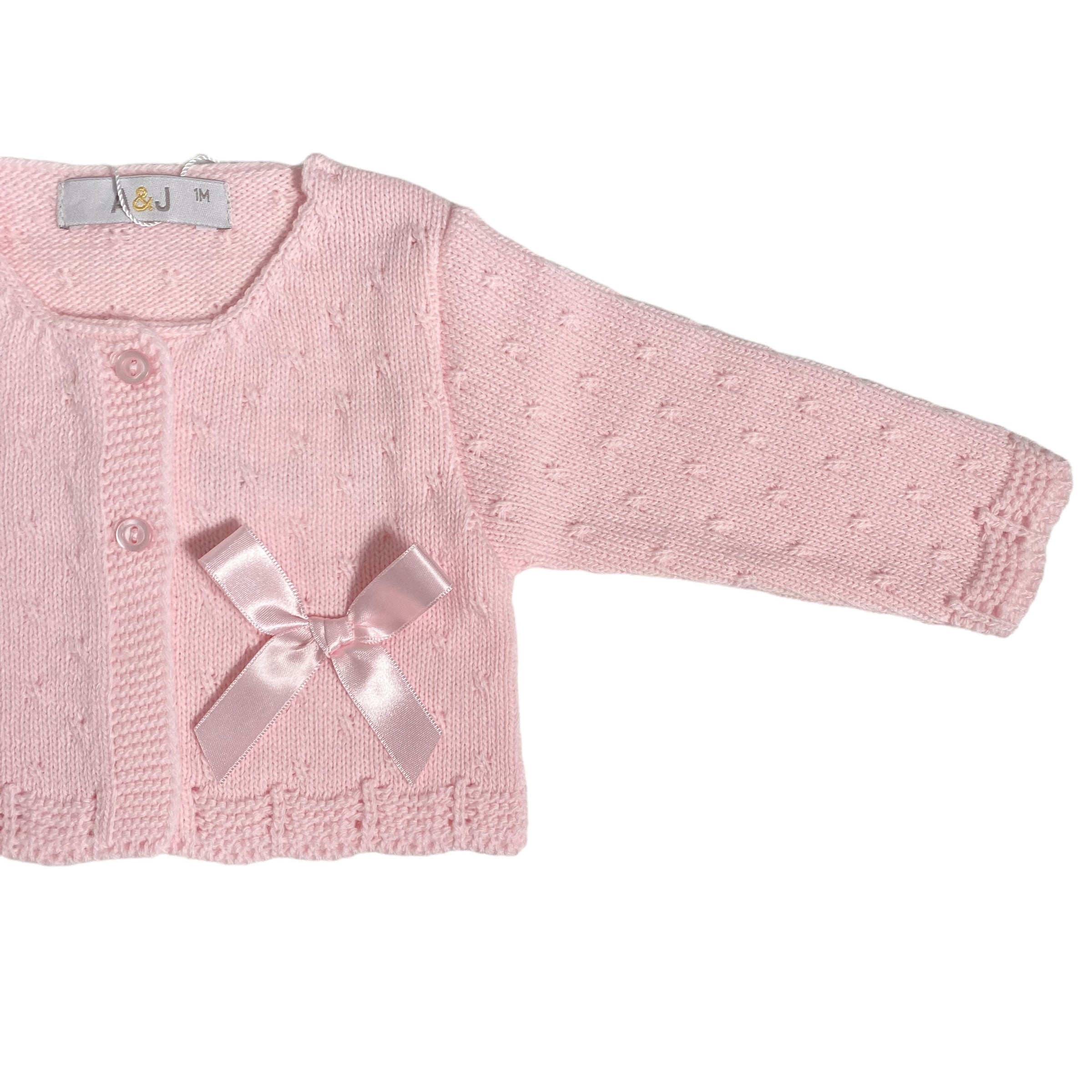 Cardigan corto in tinta unita rosa, con applicazione di fiocco in raso rosa sul davanti.