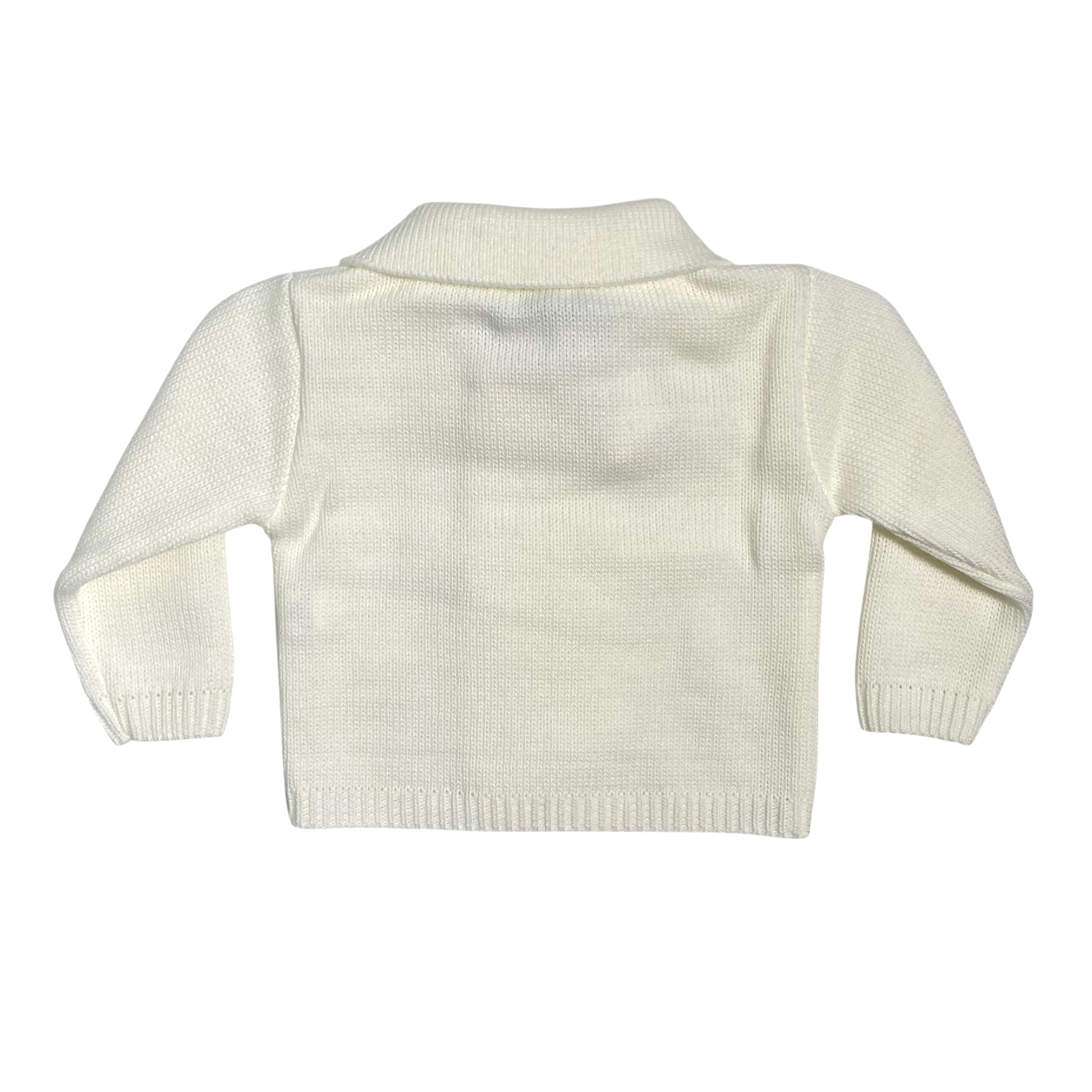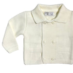 Questo cardigan in tessuto anallergico acrilico è ideale per la pelle delicata dei neonati, garantendo comfort e sicurezza. Il design con doppio petto e colletto aggiunge un tocco di eleganza, mentre la chiusura con bottoncini tono su tono permette una facile vestizione. Perfetto per completare ogni outfit, unisce praticità e stile in un capo versatile e raffinato.