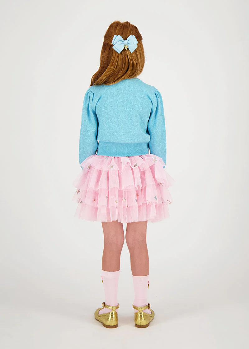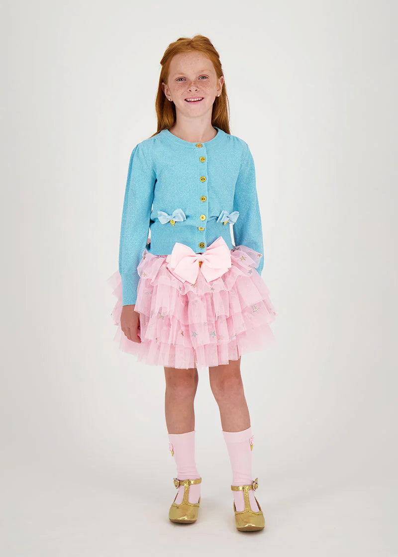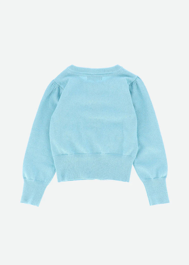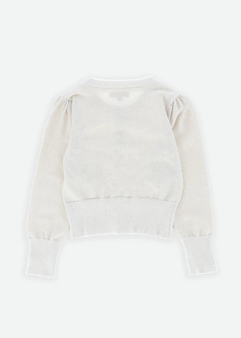 Per sua figlia, questo cardigan in caldo cotone lavorato a maglia fine con un tocco di brillantezza è un capo perfetto da indossare sopra qualsiasi abito.