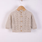 Cardigan a maniche lunghe lavorato a maglia in morbido e traspirante cotone biologico  ideale per neonati e bambine. Il cardigan SUMMER IN THE VILLAGE si chiude sul davanti con bottoni in legno. Prodotto in Wholegarment, un pezzo unico senza cuciture, per il massimo comfort del tuo bambino.