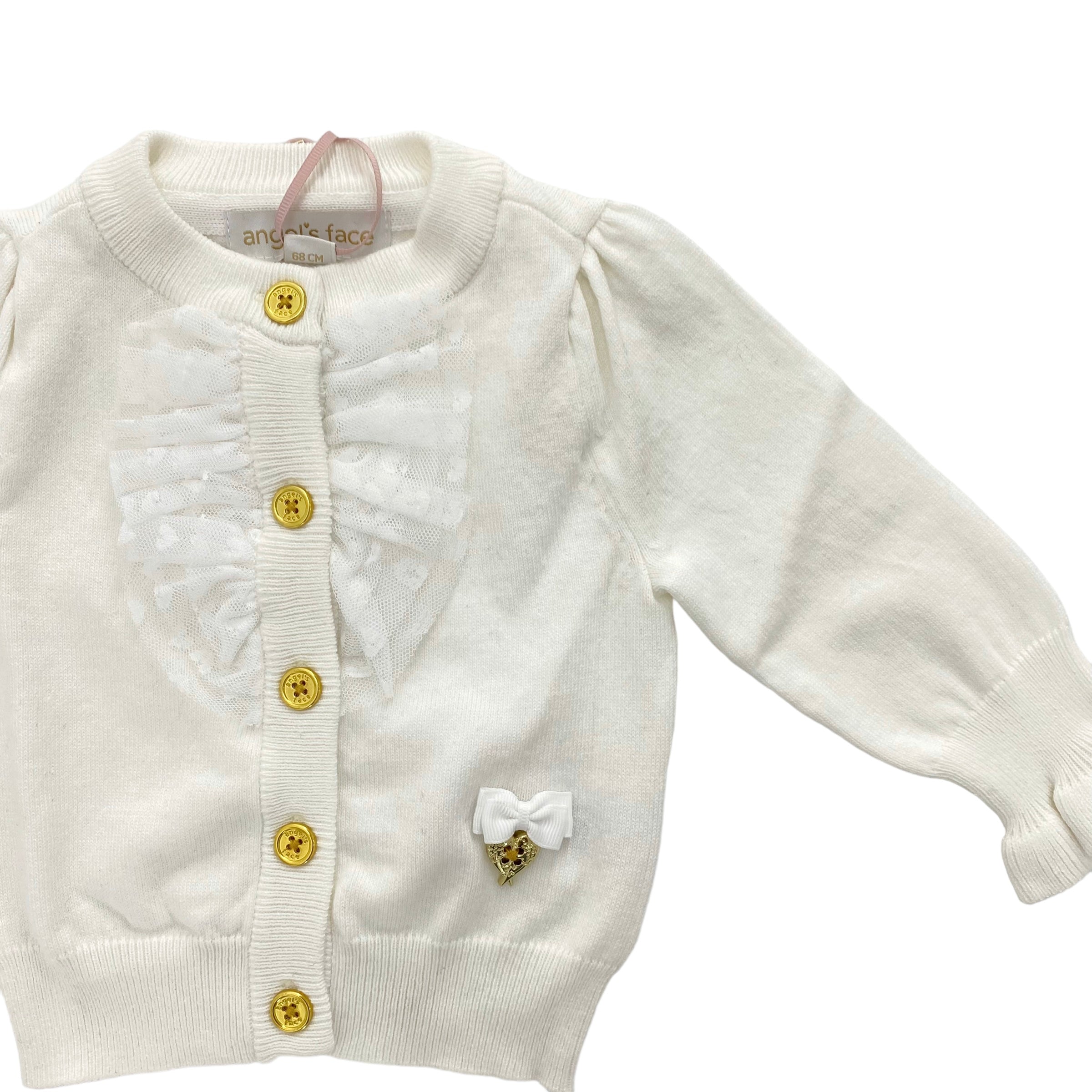 Cardigan caratterizzato da una graziosa pettorina in tulle plissettata sul davanti.