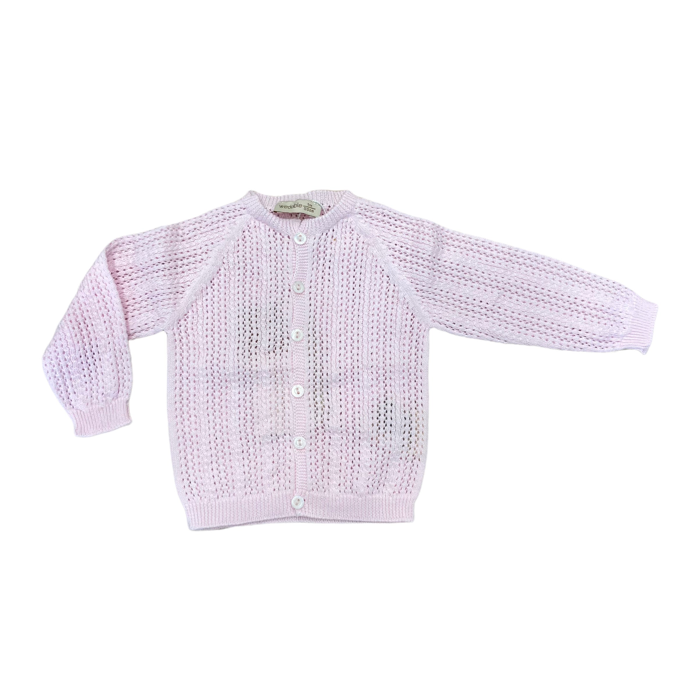 Cardigan in filo traforato in due colori celeste e rosa baby.