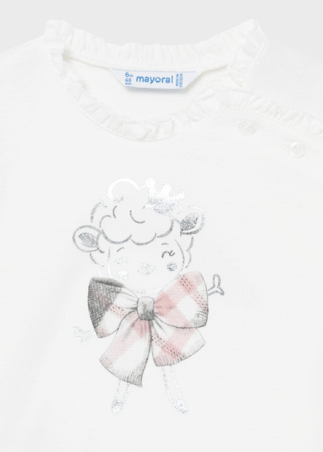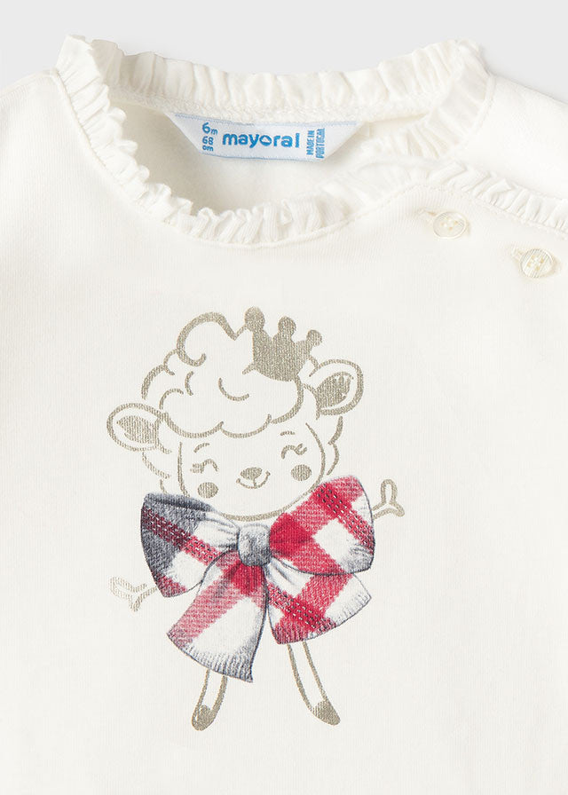 Maglietta manica lunga per neonata 6-36 mesi. Girocollo con volant. Chiusura con bottoni sulla spalla.