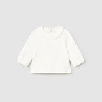 Maglietta manica lunga per neonata. Girocollo con volant. Chiusura con bottoni a pressione nella parte posteriore.
