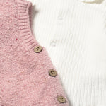 Gilet senza manica per neonata. Girocollo. Chiusura con bottoni nella parte anteriore. Bottone sulla spalla per facilitare la vestibilità del capo.