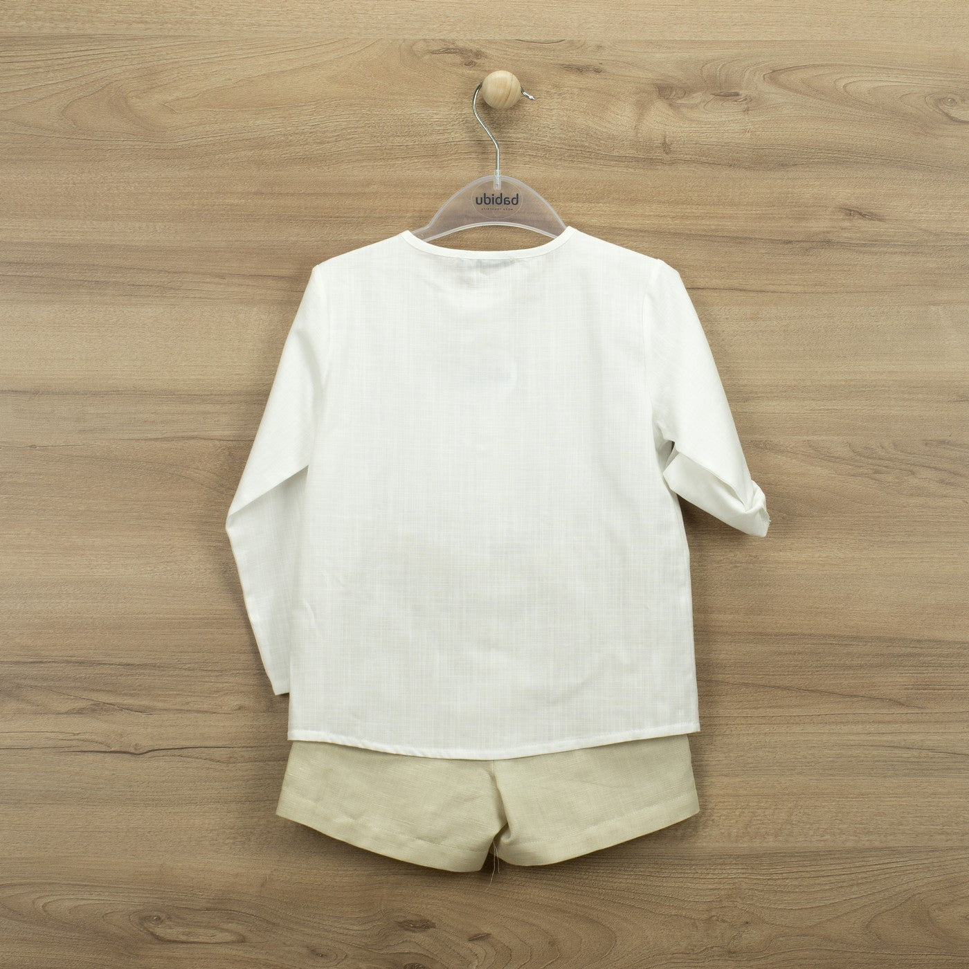 camicia bianca in cotone a collo coreano, manica lunga, ma può diventare mezza manica. Piccola apertura sul davanti con dei semplici bottoncini in legno.