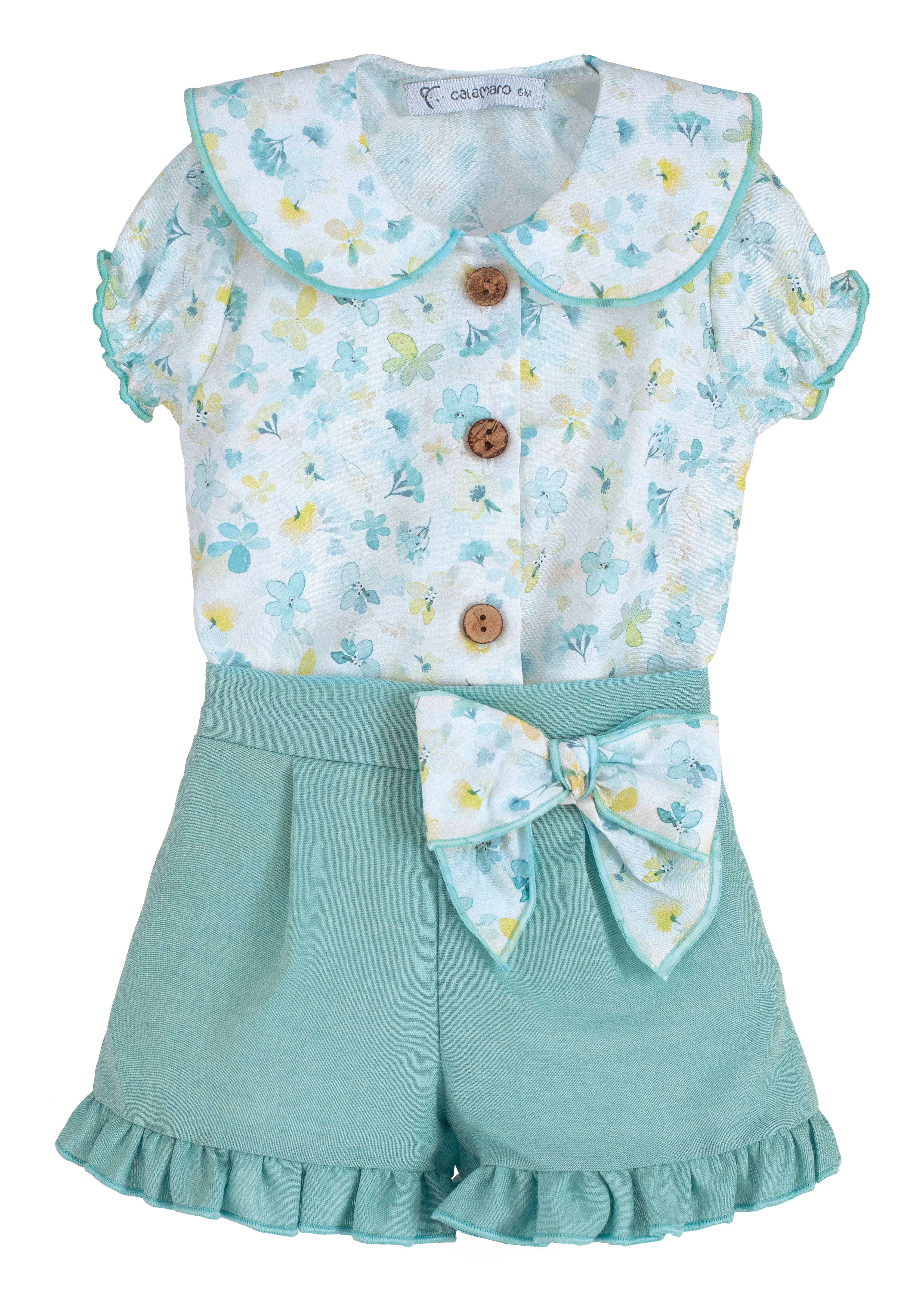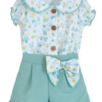 Questo completo in cotone per bambine è composto da bermuda in tinta unita verde acqua e camicia con collo tondo a fantasia floreale. Elegante, colorato e alla moda, garantisce comodità grazie alla sua composizione in cotone. Ideale per look estivi e freschi.