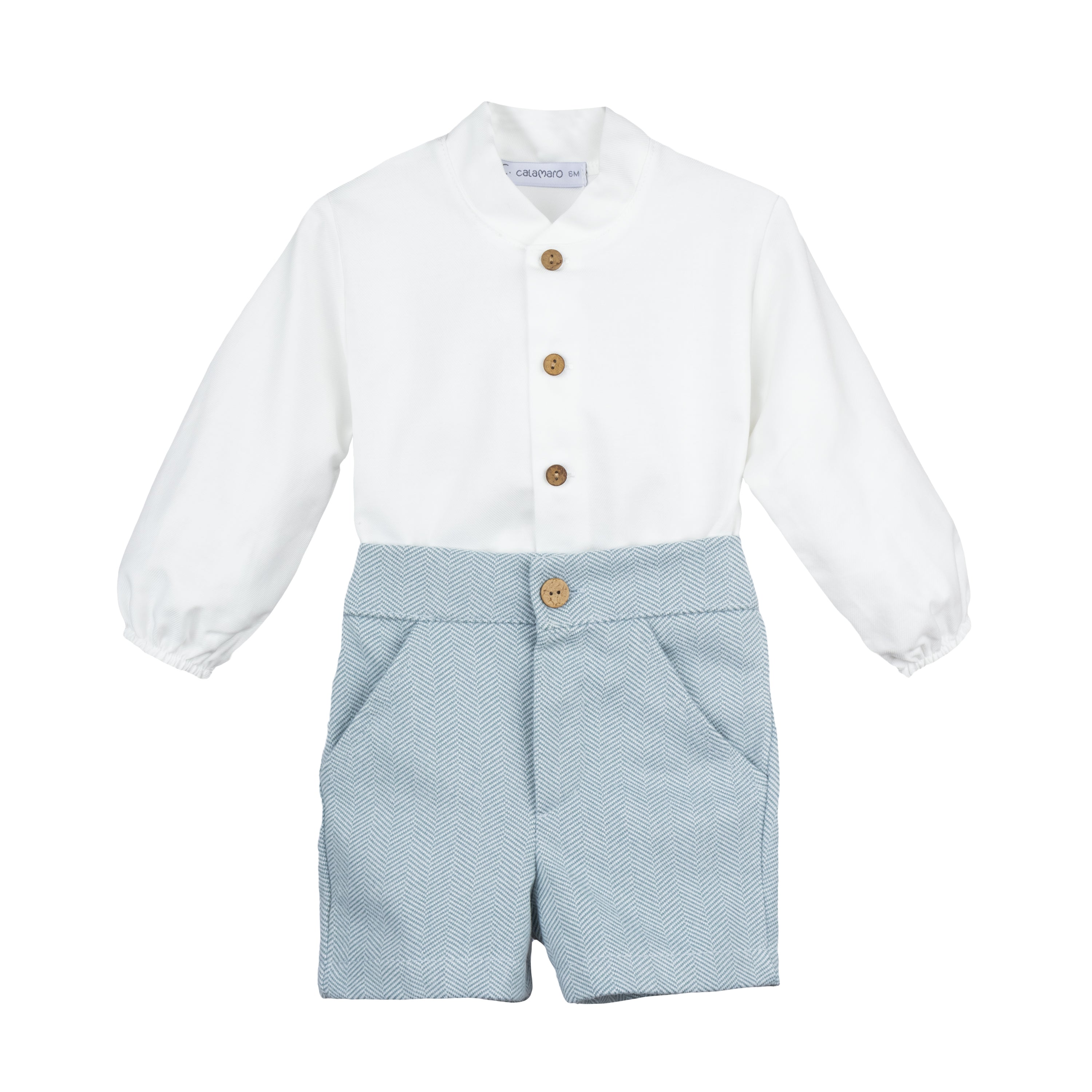 Con questo completo per bambini di CALAMARO, il tuo piccolo sarà elegante e comodo. Il soffice bermuda in panno a fantasia spigata e la camicia in caldo cotone con chiusura a bottoncini di legno sono perfetti per un look casual chic. Un must-have per ogni genitore esperto!