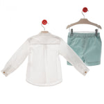 Questo completo elegante è perfetto per il tuo bambino! Include una camicia in lino con collo coreano e bottoncini effetto legno, abbinata a un comodo bermuda. Il look ideale per occasioni speciali e piccoli paggetti.