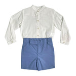 Questo completo elegante è perfetto per il tuo bambino! Include una camicia in lino con collo coreano e bottoncini bianchi, abbinata a un comodo bermuda. Il look ideale per occasioni speciali e piccoli paggetti.