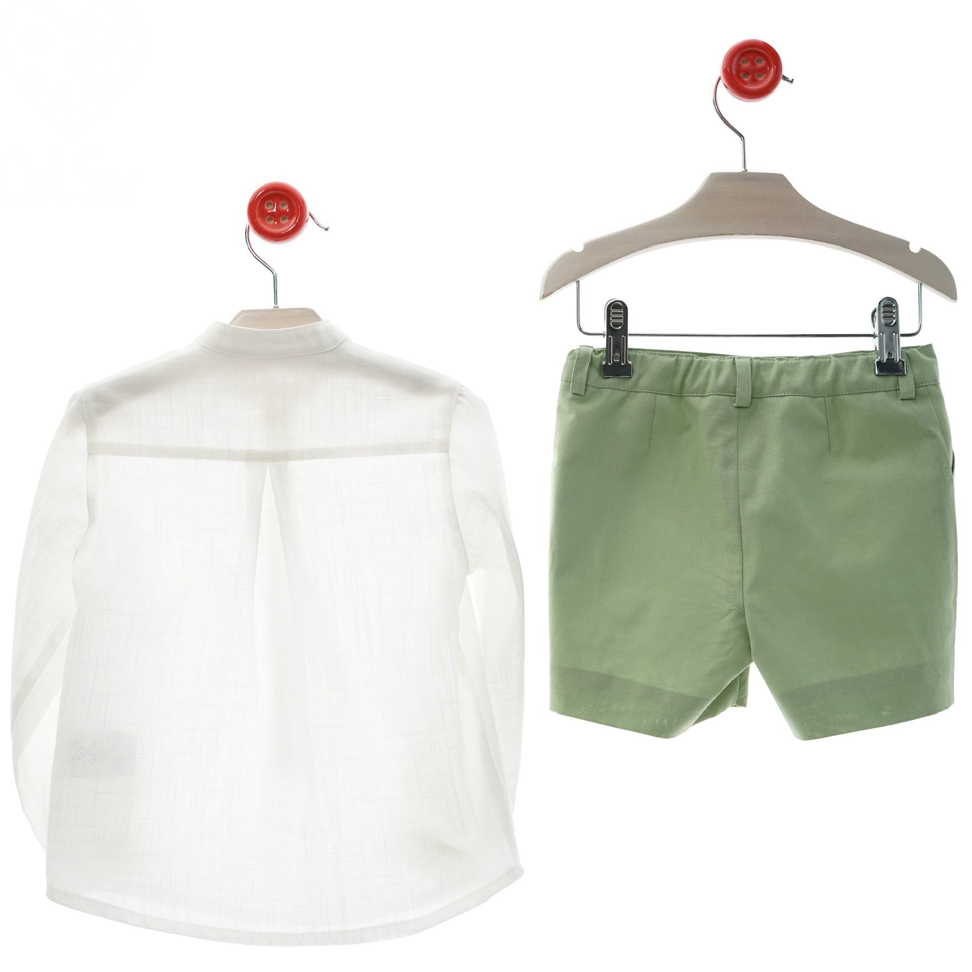 Con questo completo in cotone e lino, il tuo bambino sarà elegante e raffinato in ogni occasione. Il bermuda con tasca america si abbina perfettamente alla camicia bianca con collo coreano, perfetta per cerimonie o per il ruolo di paggetto.