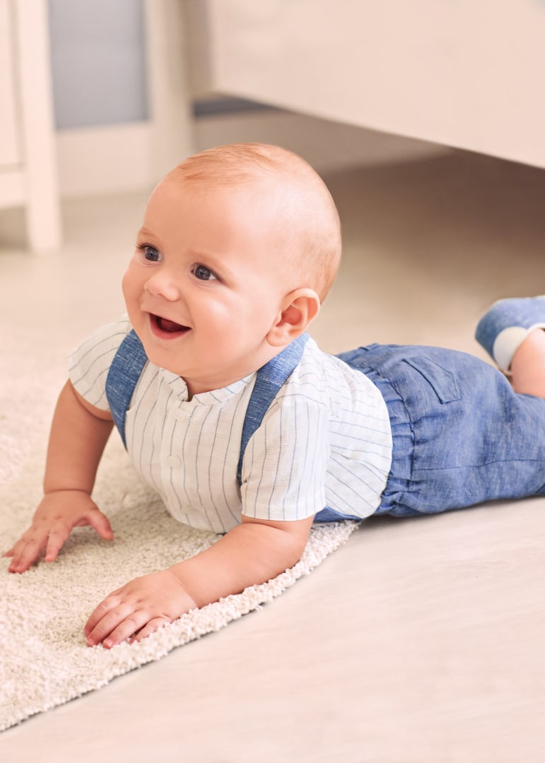 Camicia manica corta per neonato. Modello con colletto alla coreana ton sur ton. Chiusura con bottoni nella parte anteriore. Tessuto dall'aspetto fresco e moderno di lino.