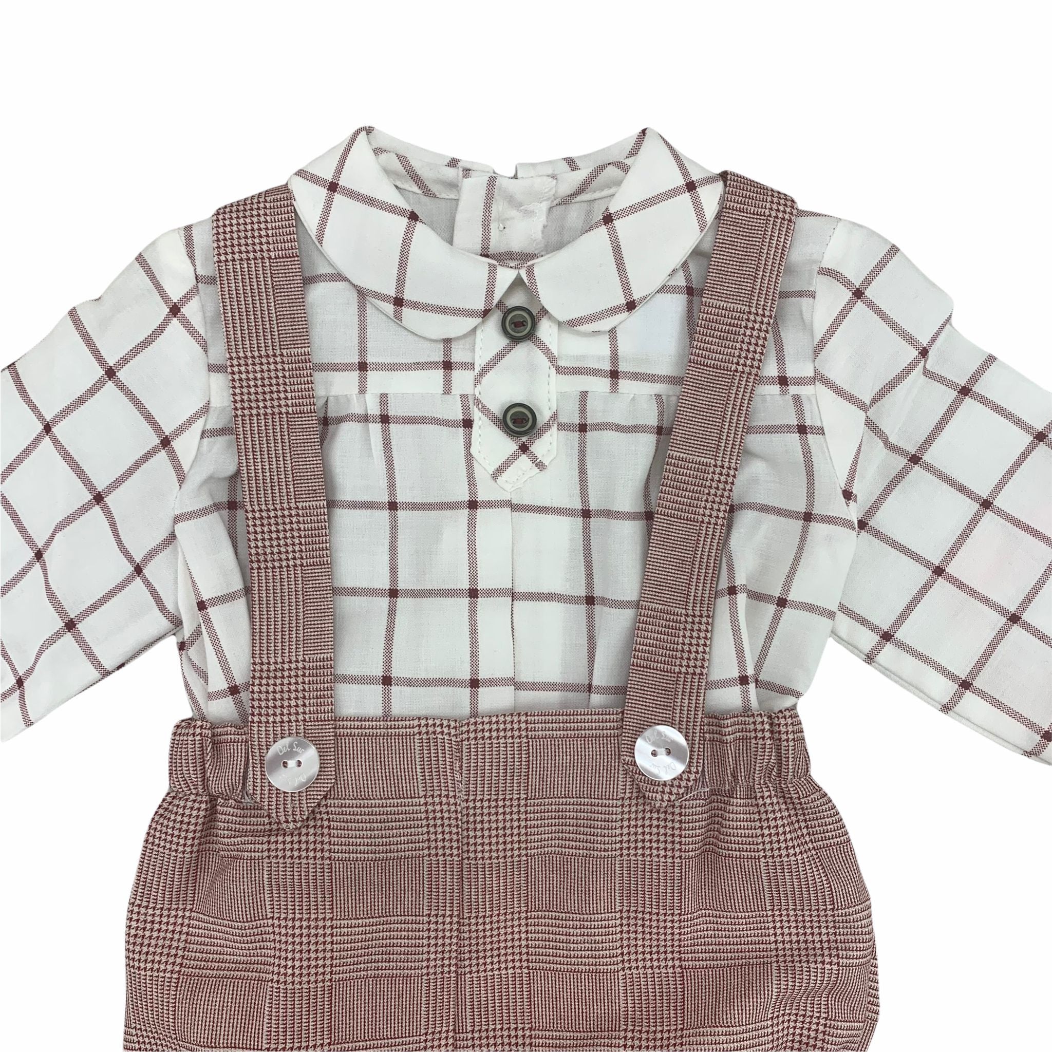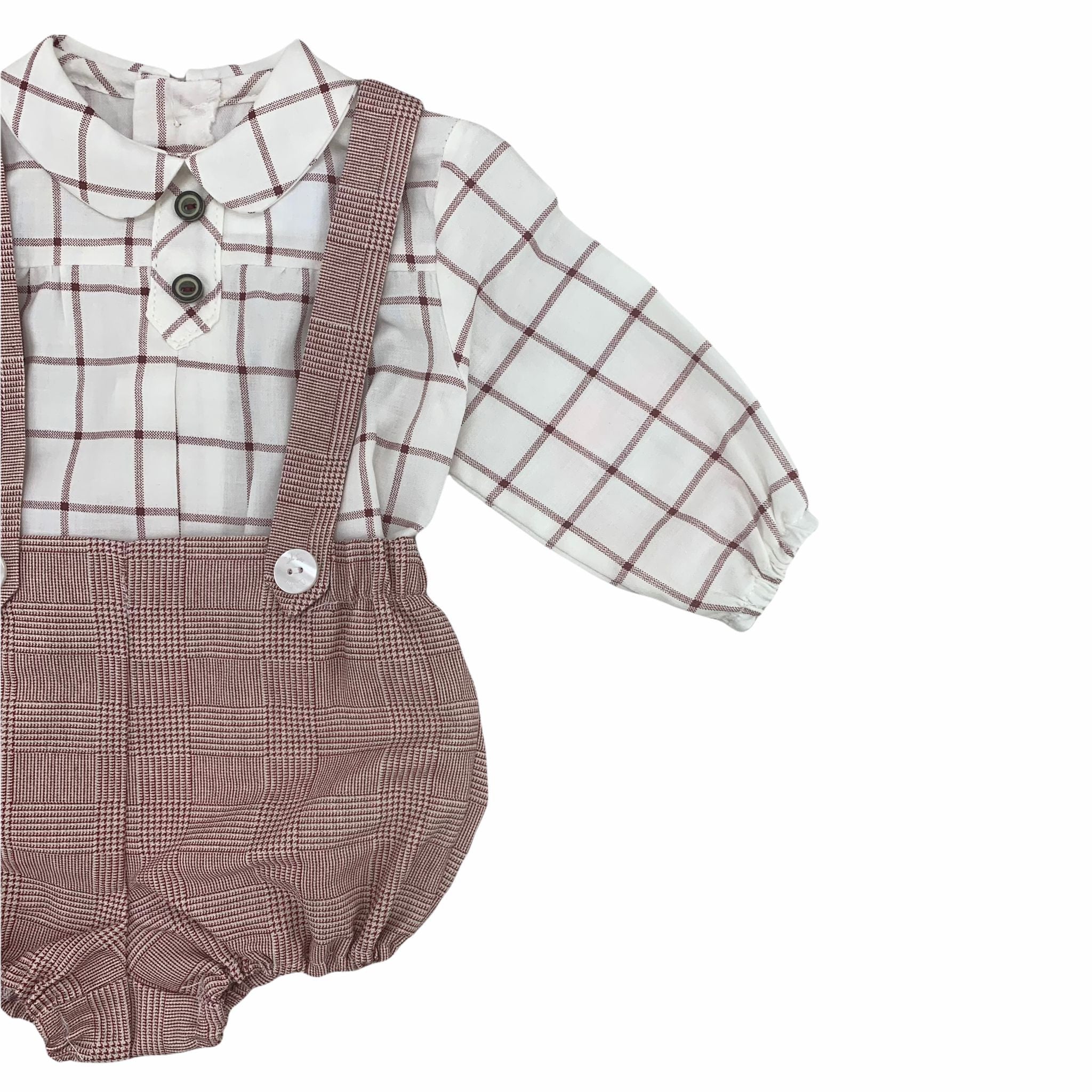 Completo composto da culotte con bretelle, fantasia a quadri e camicia a quadri con chiusura posteriore.