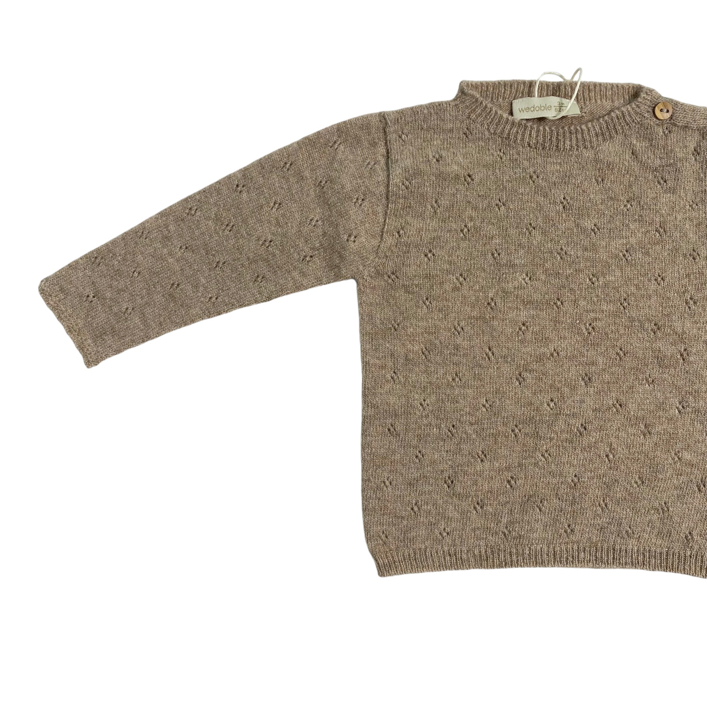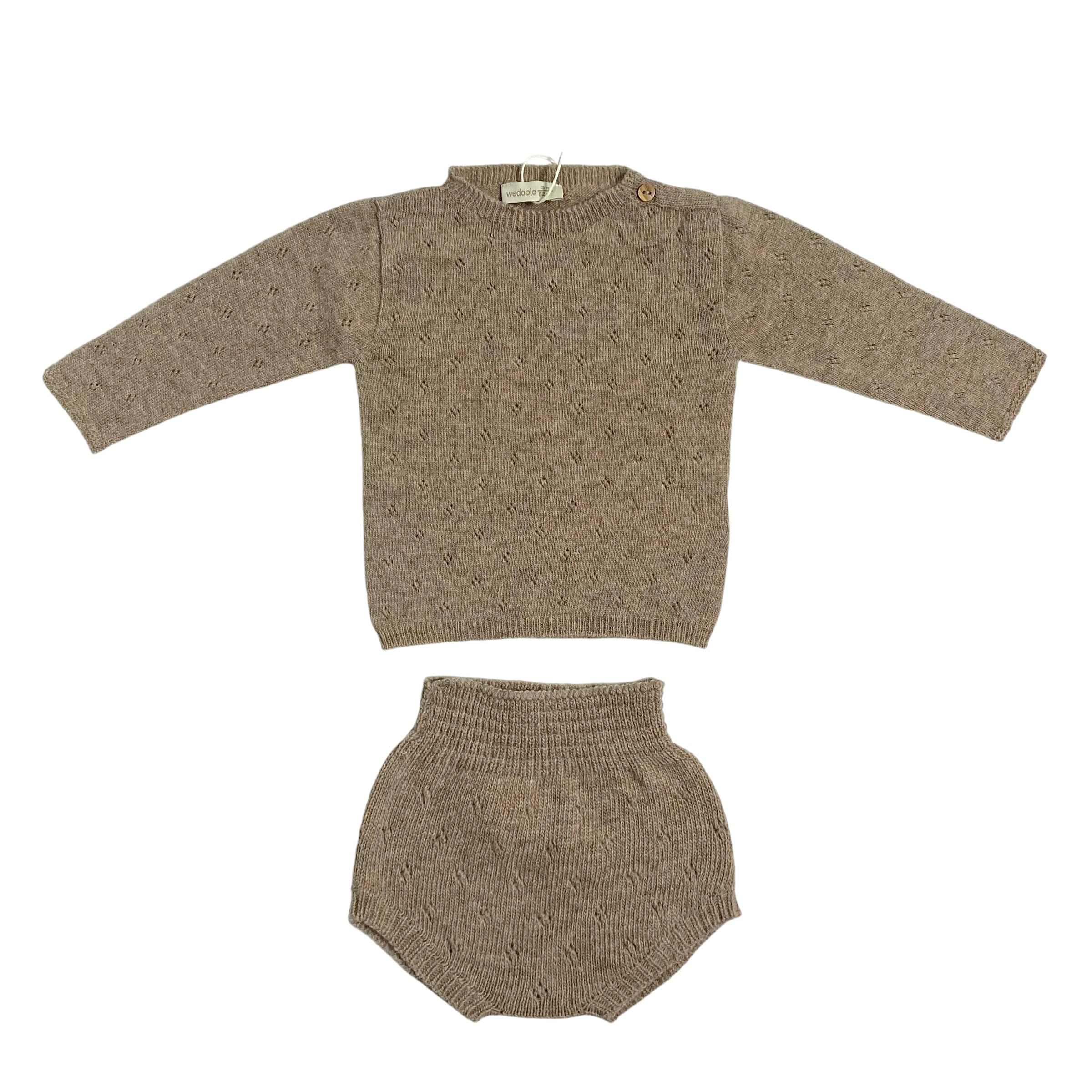 Culotte e maglione a maniche lunghe lavorato a maglia in morbida lana merino extra fine, ottimo per neonati. Il maglione TONES OF GARDENS IN WINTER è lavorato a punto ajour e si chiude sulla spalla con bottoni in legno. Realizzato con la tecnologia Wholegarment, questo capo è privo di cuciture per il massimo comfort del tuo bambino.