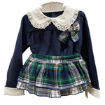 -maglioncino(felpa) svasato foderato internamente in pile ,colletto tondo in contrasto bianco rifinito con pizzo san gallo ,fiocco laterale dello stesso tessuto della culotte(scozzese) ,apertura sul retro con bottoni in legno