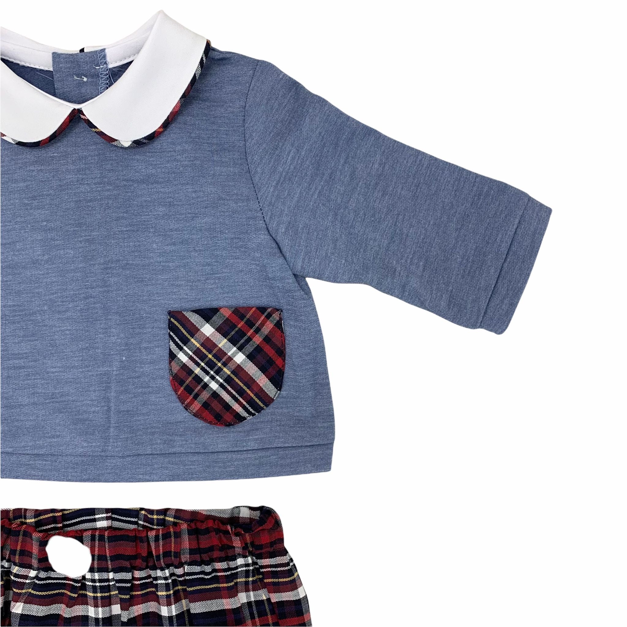 Completo con culotte scozzese con elastico in vita e maglietta effetto jeans con taschino e colletto, maniche lunghe e chiusura posteriore con bottoni.