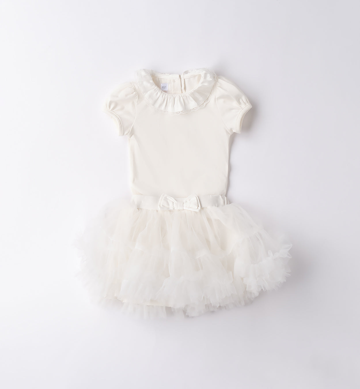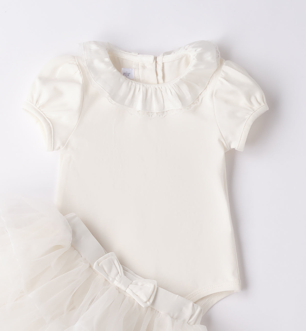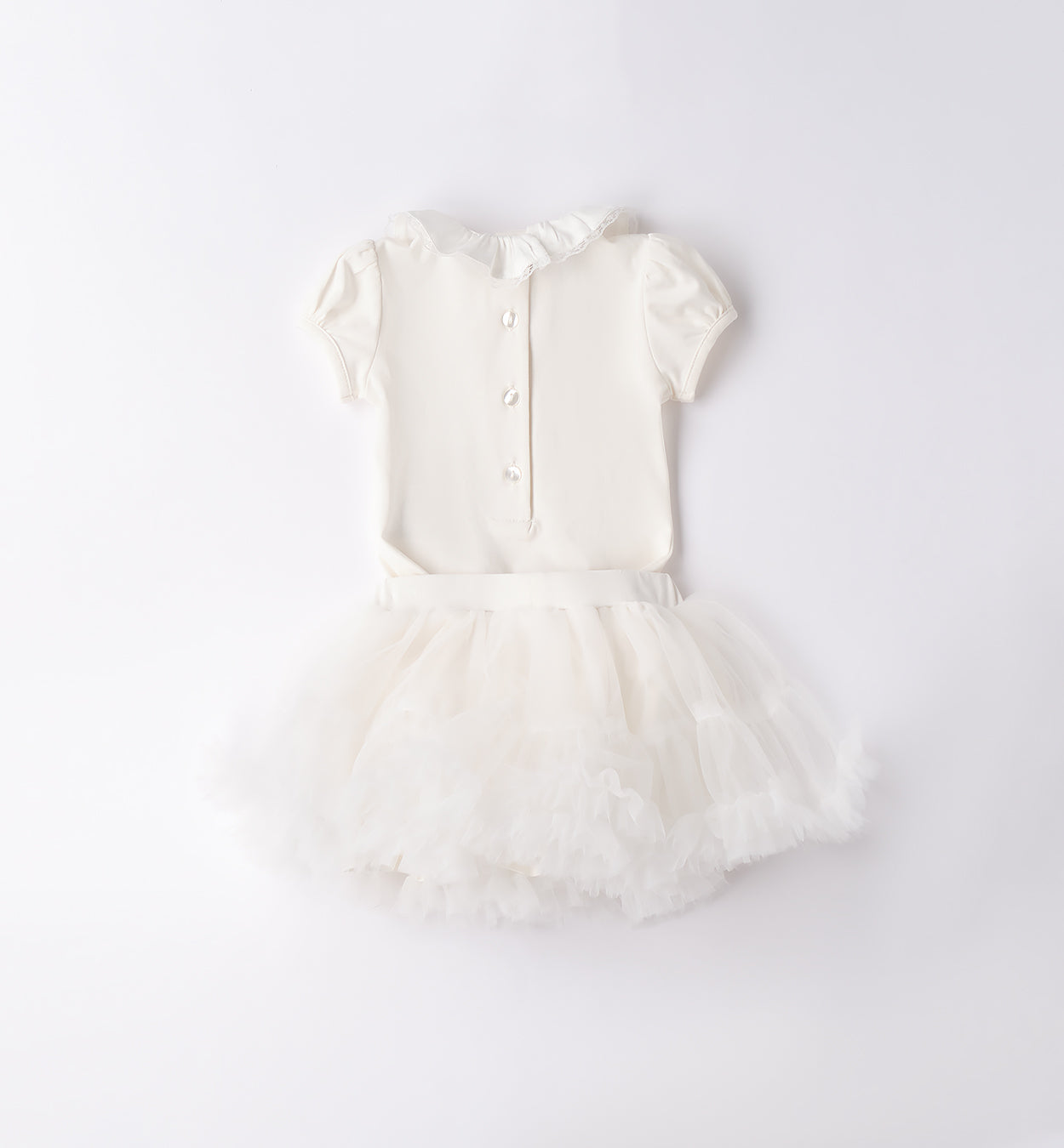 Completo neonata Minibanda. Il body è in jersey stretch di cotone e presenta apertura sul retro e nel sottogamba con bottoni a pressione per agevolare il cambio e la vestizione. La gonna è in tulle ed è foderata. Lunghezza al ginocchio. Acquistando prodotti in cotone, stai sostenendo l'impegno di Minibanda nella missione Better Cotton.