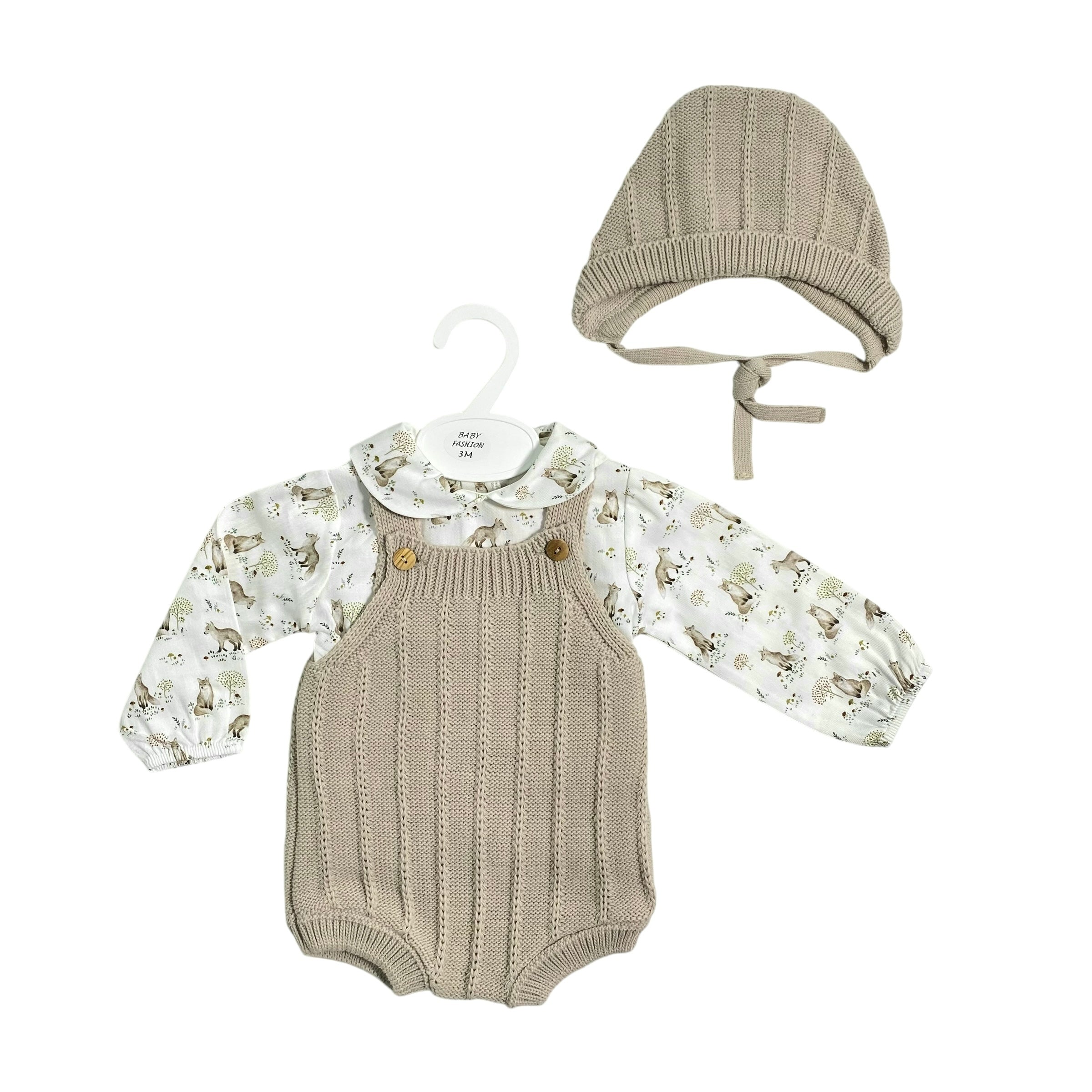 Il completo BABY FASHION è perfetto per il tuo neonato! Include un pagliaccetto e una camicia stampata con un colletto tondo, insieme ad una cuffia abbinata. Elegante, casual e alla moda, questo completo è ideale per ogni occasione.