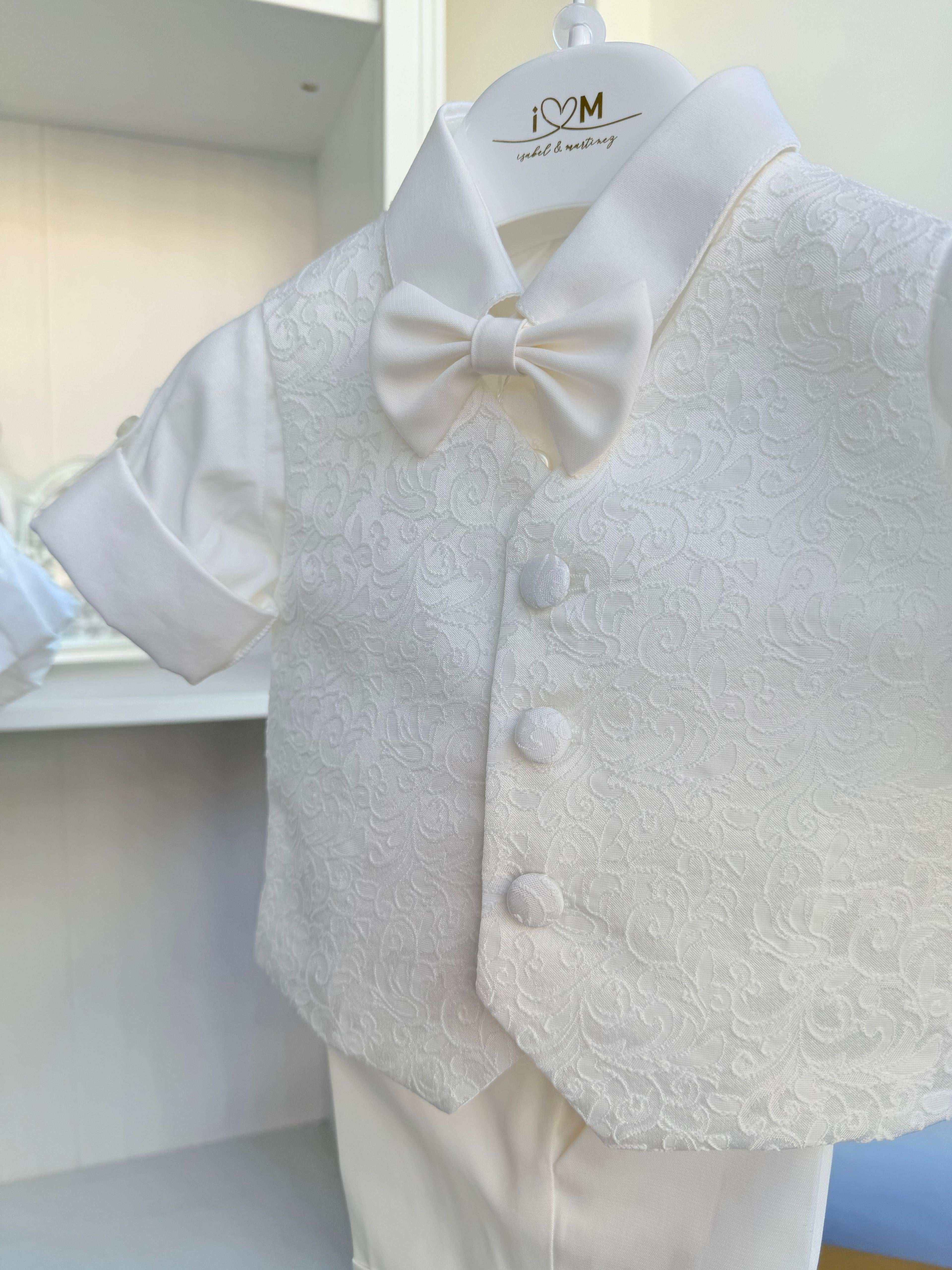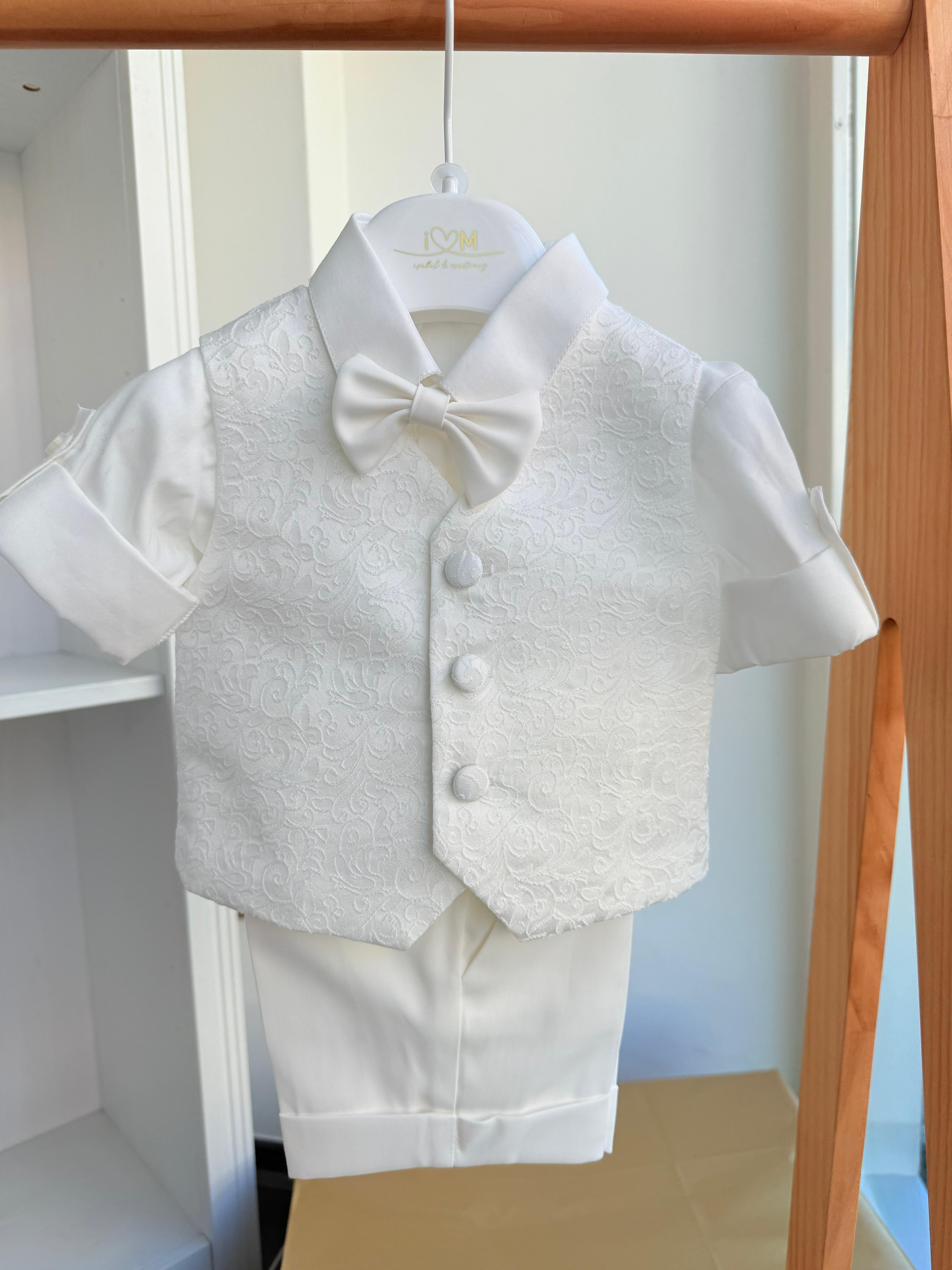 Il Completo con Panciotto Elegante Bianco Latte Neonato Isabel è perfetto per cerimonie e battesimi. Composto da 4 pezzi, con una camicia in cotone manica lunga che diventa anche mezza manica, bermuda alla moda con elastico in vita, panciotto damascato colore su colore e papillon coordinato. Tutti i dettagli per uno stile elegante e comodo per il tuo bambino.