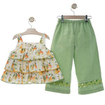 Questo completo bambina è perfetto per ogni occasione, sia elegante che casual. Il pantalone palazzo in effetto lino è confortevole e stiloso, mentre il top stampato aggiunge un tocco di originalità. Ideale per ogni età!